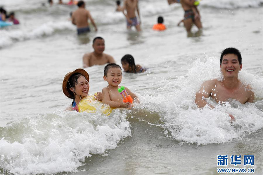 8月4日,在广西北海市银滩,人们在戏水游玩。当日,广西北海市银滩引来大批游客,大家在这里戏水游玩,快乐消暑。新华社记者 陆波岸 摄