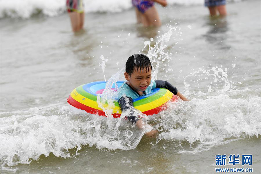 8月4日,在广西北海市银滩,一名小朋友在戏水游玩。当日,广西北海市银滩引来大批游客,大家在这里戏水游玩,快乐消暑。新华社记者 陆波岸 摄
