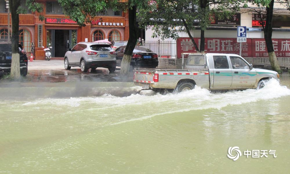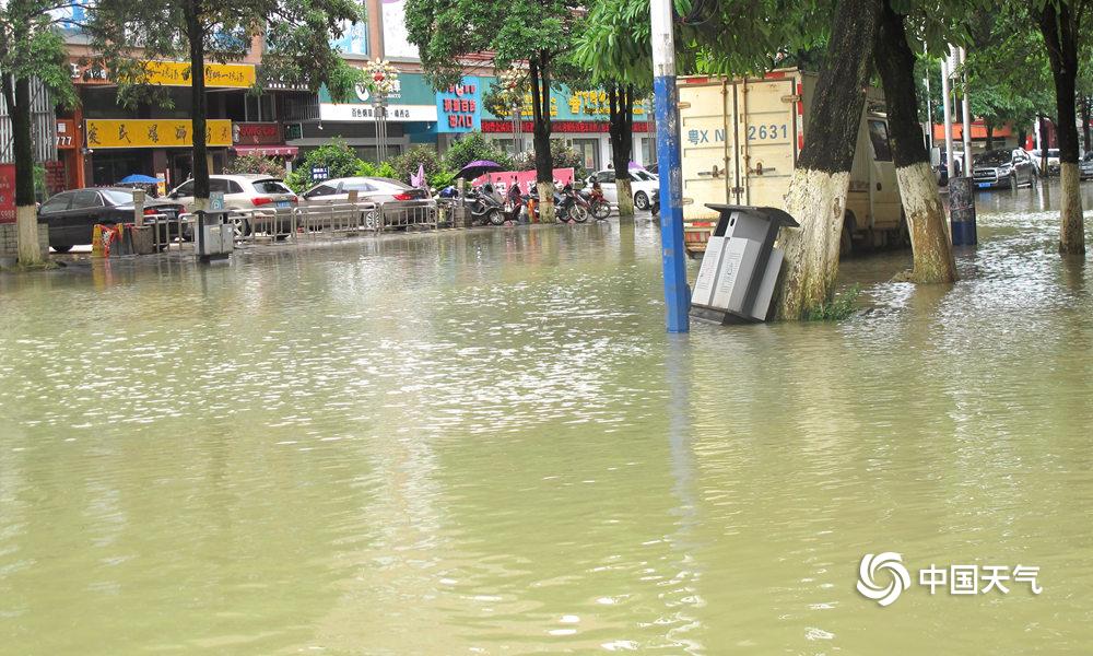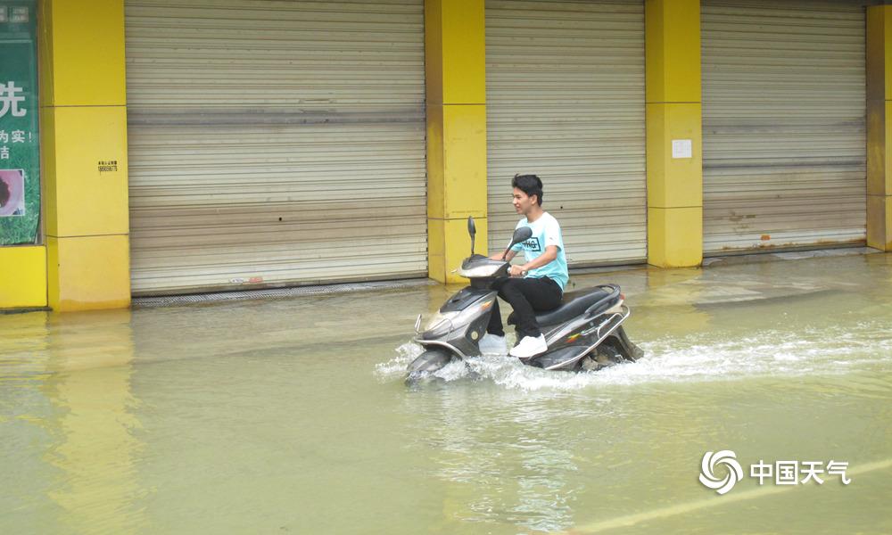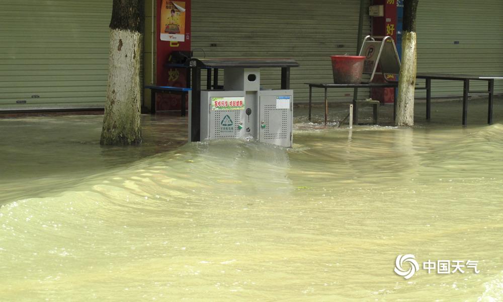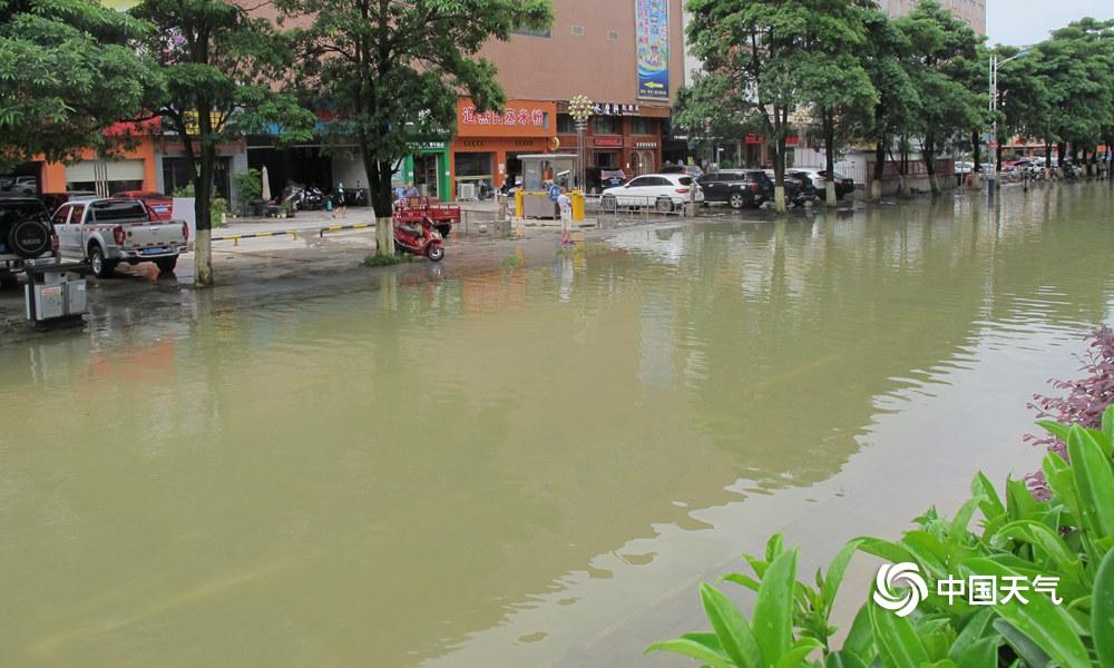 中国天气网广西站讯 受季风槽和低涡共同影响,8月6日20时至7日20时,靖西降雨量85毫米,达暴雨量级。强降雨导致靖西环球商业中心附近城中路,金山华苑小区门口路段积水严重,对市民的日常出行及附近商家的正常营业造成了不便。(图文/庞彩霞)
