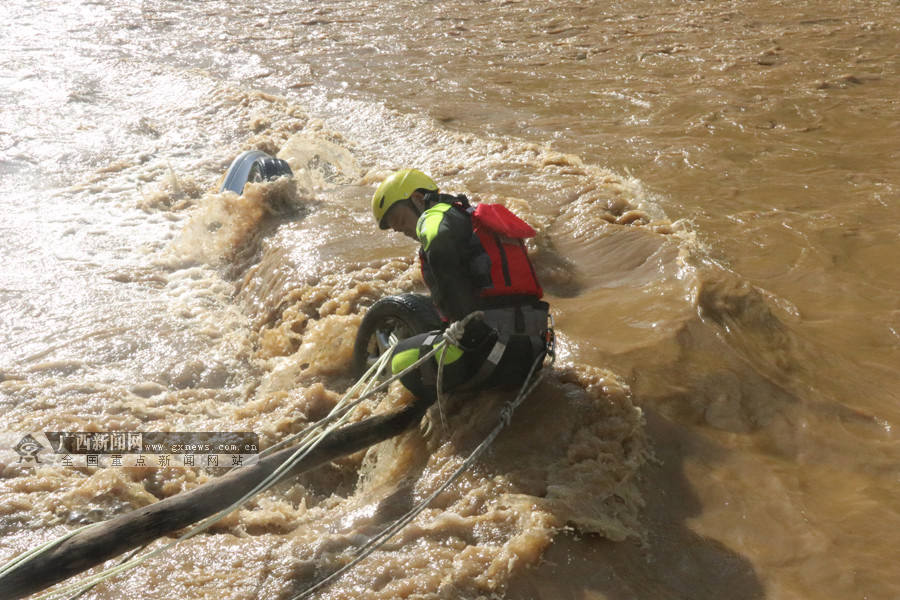救援人员涉水固定车辆。广西新闻网通讯员 石远波 黄馨慧 陆瑞良供图