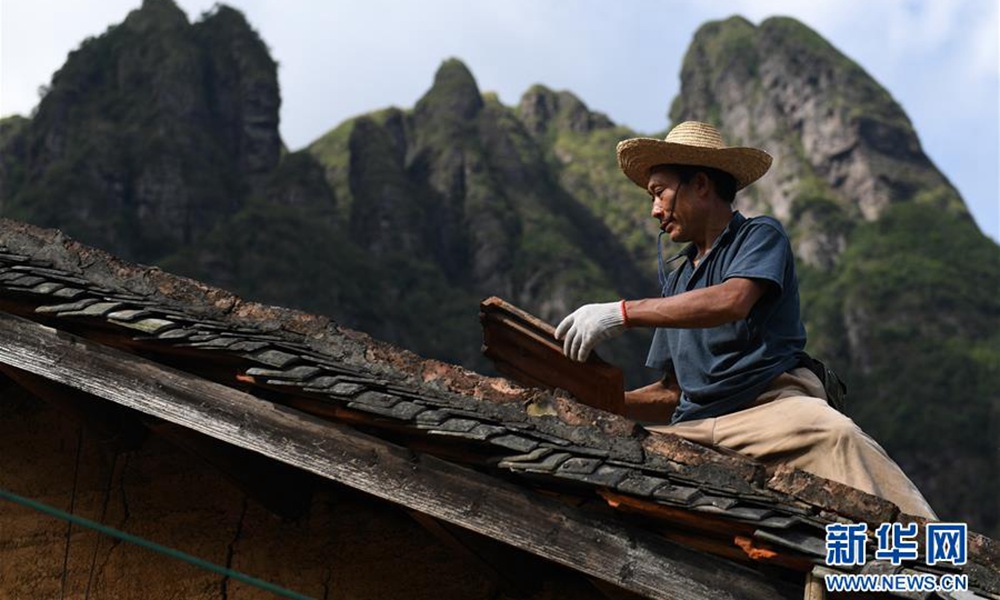 受台风“山竹”影响,广西金秀瑶族自治县9个乡镇不同程度受灾。目前,当地正开展灾后重建,恢复生产。图为9月19日,金秀瑶族自治县六巷乡石架村村民在修复被台风损毁的房屋瓦片。(摄影:陆波岸)