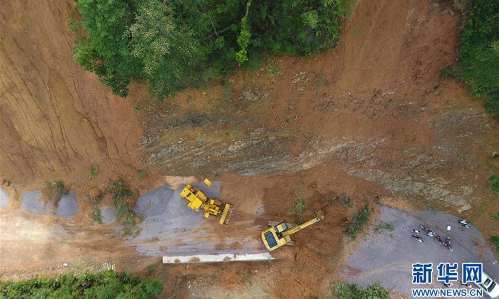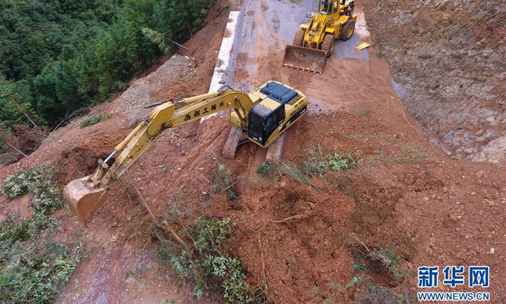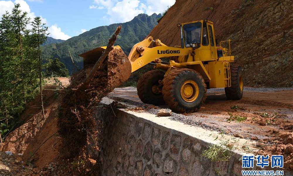 受台风“山竹”影响,广西金秀瑶族自治县9个乡镇不同程度受灾。目前,当地正开展灾后重建,恢复生产。图为9月19日,施工人员在金秀瑶族自治县六巷乡六巷村疏通道路。(摄影:陆波岸)