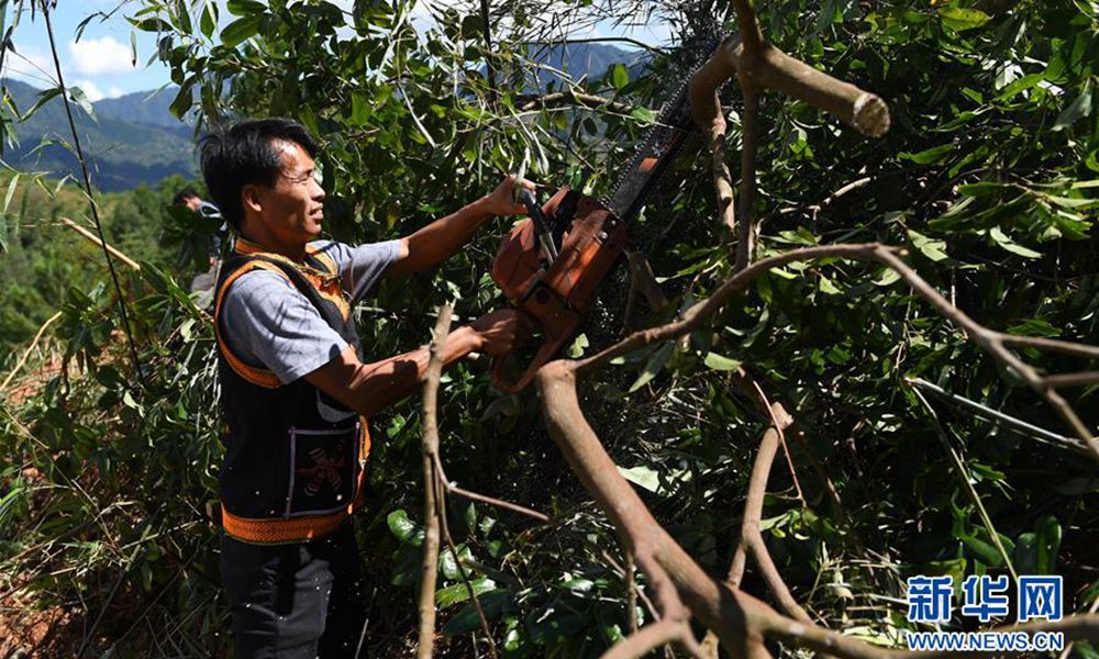 受台风“山竹”影响,广西金秀瑶族自治县9个乡镇不同程度受灾。目前,当地正开展灾后重建,恢复生产。图为9月19日,一名男子在金秀瑶族自治县六巷乡六巷村清理倒伏树木。(摄影:陆波岸)