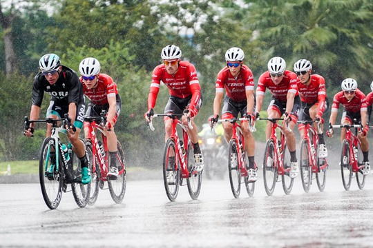 中国天气网广西站讯 今天(18日)上午,2018“环广西”公路自行车世界巡回赛南宁绕圈赛开赛,赛段绕南宁市区骑行4圈,共计125.4公里。该段赛道有本次世巡赛最长的冲刺赛段,长达8公里,极具观赏性。比赛于11:30正式发车,在进行到第三圈的时候,南宁上空飘起了雨,雨势渐大,但是选手们之间的争夺并未减弱,经过两个多小时的激烈角逐,来自快步地板车队的小将法比奥·雅克布森获得南宁绕圈赛冠军。图为比赛进行中(图文/刘英轶)