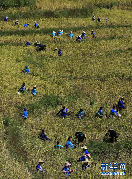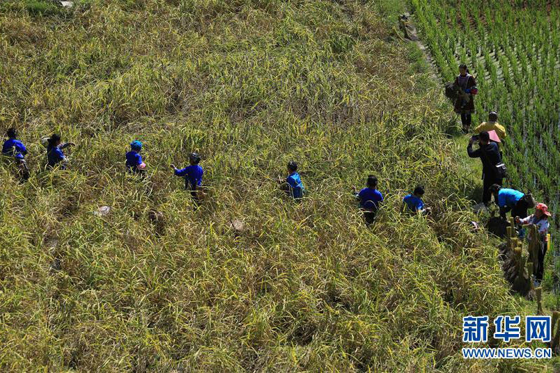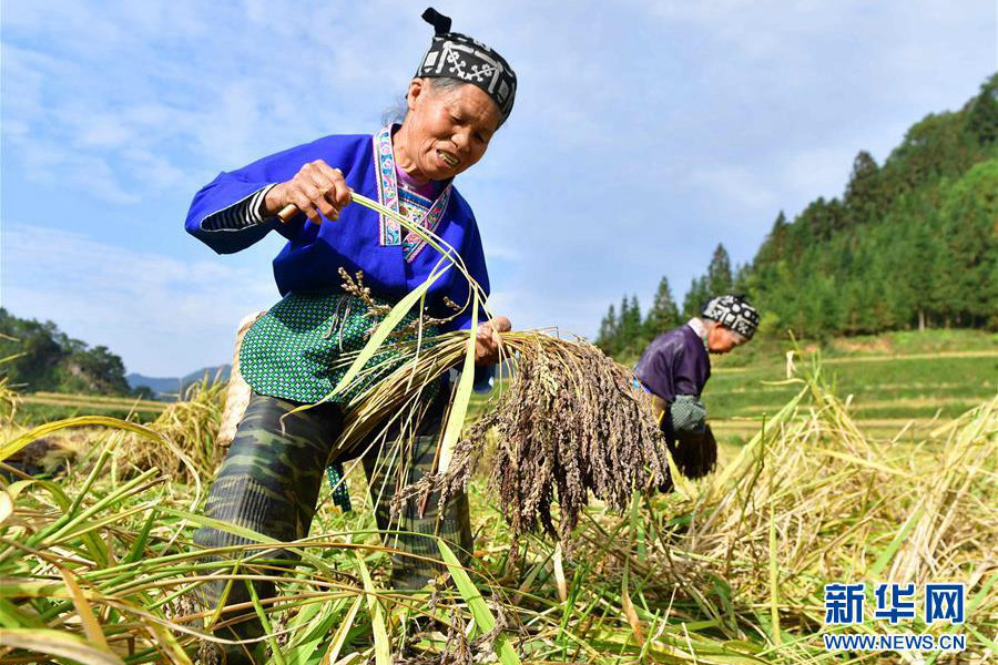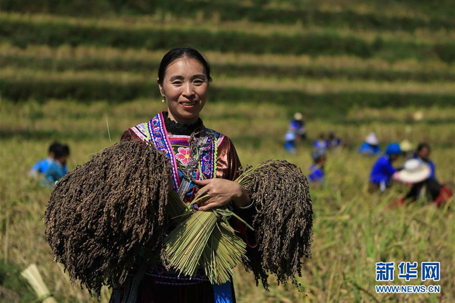 10月30日,在广西融水苗族自治县安太乡元宝村,村民在收获香糯。新华社记者 吴建路 摄