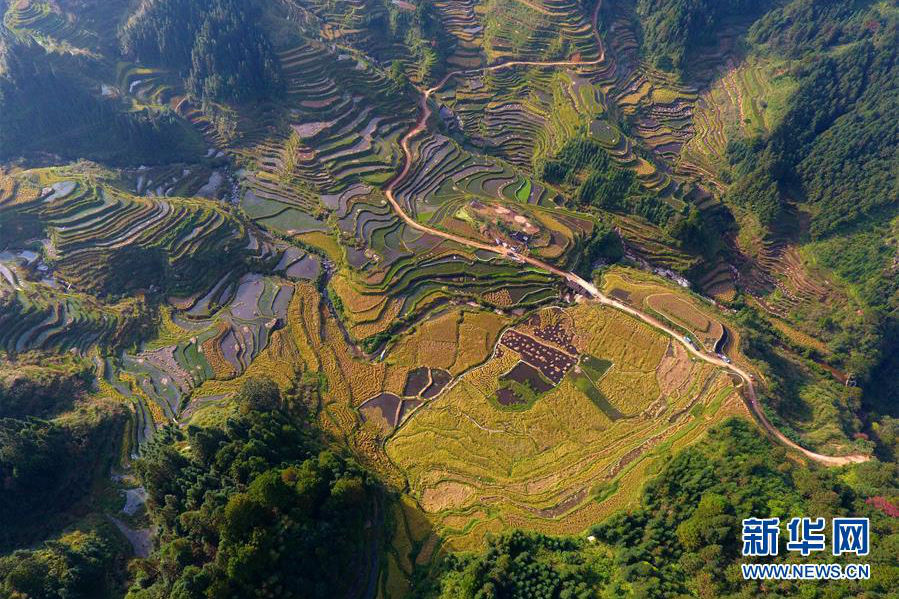 这是广西融水苗族自治县安太乡元宝村香糯种植基地(10月30日无人机拍摄)。新华社记者 吴建路 摄