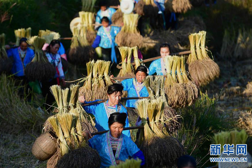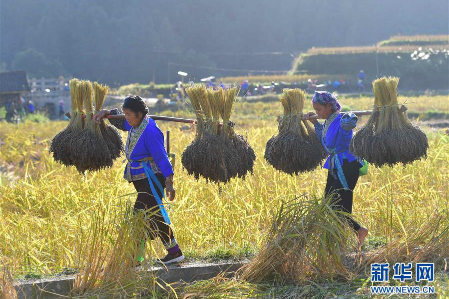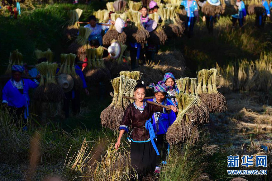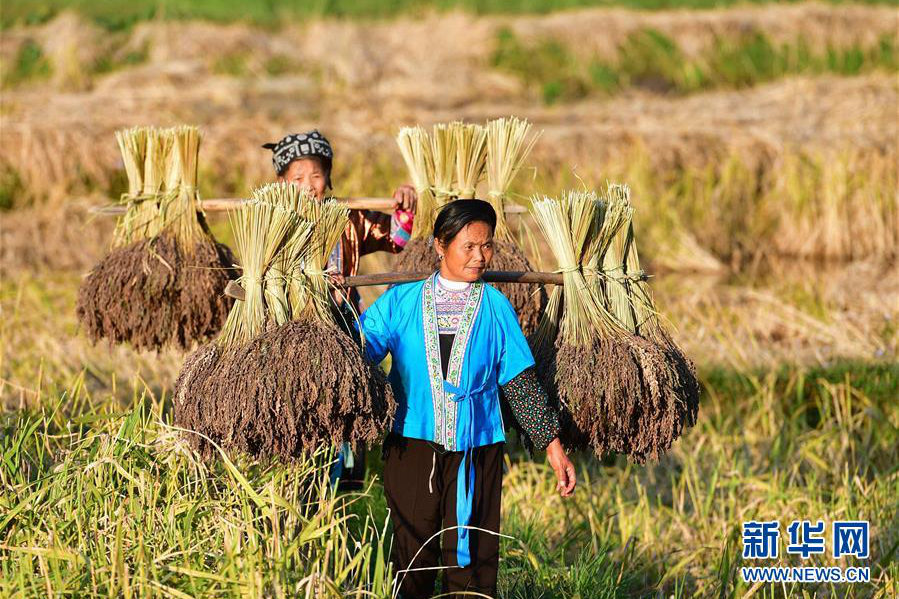 10月30日,在广西融水苗族自治县安太乡元宝村,村民挑着香糯走在田间。新华社记者 黄孝邦 摄