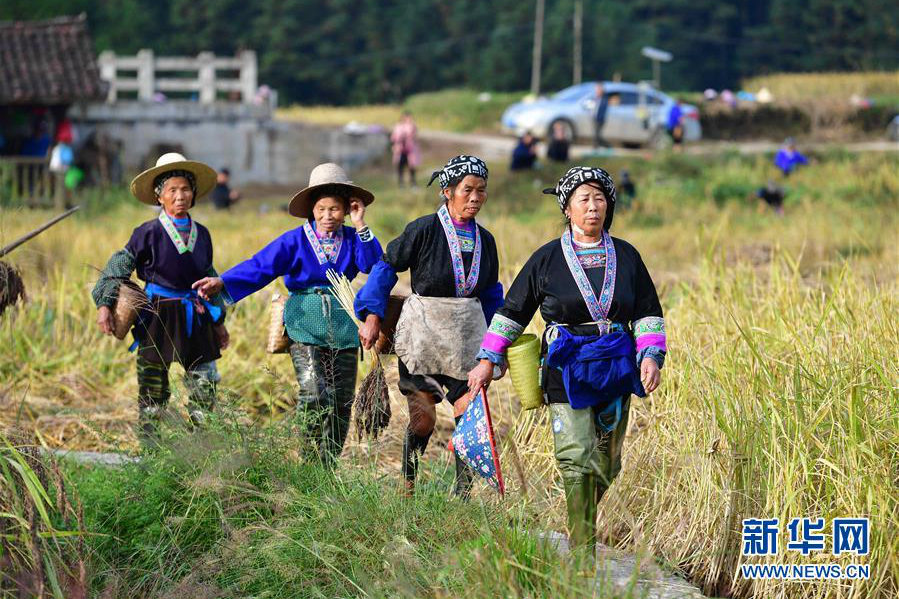10月30日,在广西融水苗族自治县安太乡元宝村,村民走在田间,准备收获香糯。新华社记者 吴建路 摄