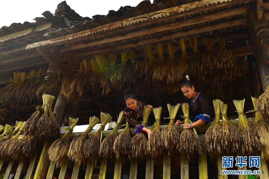 10月30日,在广西融水苗族自治县安太乡元宝村,村民在风雨桥上晾晒刚刚收获的香糯。新华社记者 吴建路 摄