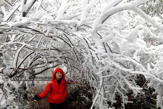 中国天气网广西站讯 受强冷空气南下影响,资源隘门界气温骤降,一场大规模的雨凇景观如约而至,一眼望去满山遍野铺满冰晶,煞是好看。花草树木仿佛披上一层晶莹的玉衣,被雨凇妆点成了银枝玉叶,如同进入了琉璃世界。尖尖的绿叶、黄色的小花、枝头的嫩芽,还有路面上的鹅卵石……仿佛是被水晶包裹了一般,分外晶莹剔透,闪烁生辉。(文/胡静 图/蒋熙)