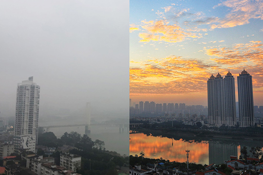 中国天气网广西站讯 告别了连续多日的阴雨天气,16日起桂林终于迎来了明媚的阳光。近两天的早晨,桂林天空连续出现了难得的“鱼鳞云”美景。蔚蓝的天空中,一朵朵似棉花般的云有序排列,就像鱼身上的鳞片一般,层层叠叠的云朵铺满整个天空,与朝霞、晚霞交相辉映,格外美丽。(文/胡静 图/蔡晓庆)
