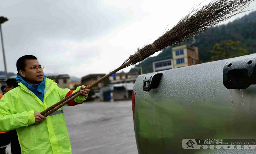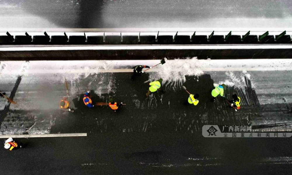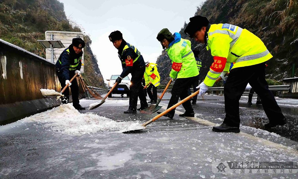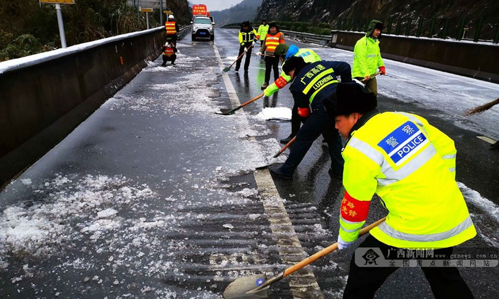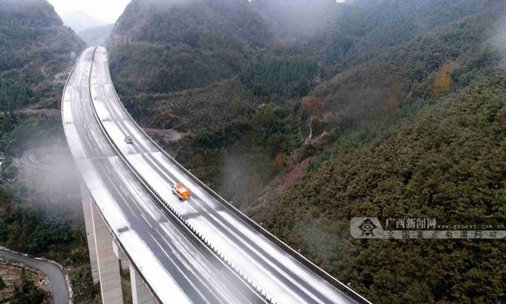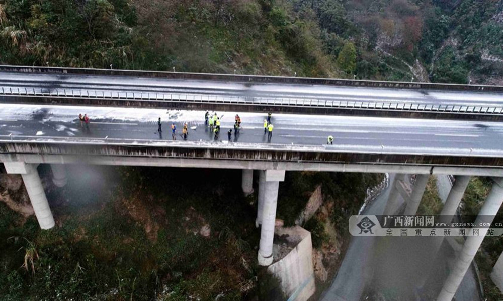 12月30日凌晨,兰海高速公路广西南丹县路段出现降雪天气,路面结冰约2厘米,导致兰海高速公路广西南丹路段交通中断,车辆绕行国道210线。冰冻灾害发生后,河池高速公路运营有限公司、高速路政、市交警支队密切合作,除雪融冰,抗冰保畅。(图文/高东风)