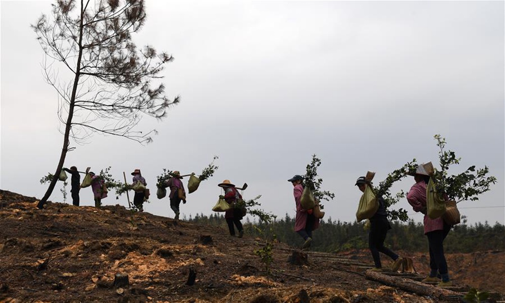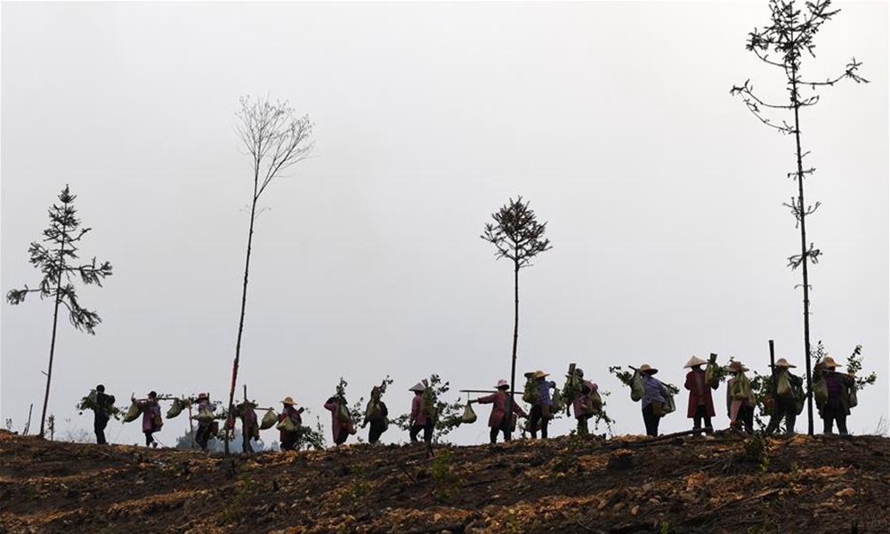 当日,广西三江侗族自治县丹洲古篮千亩油茶基地一片忙碌,当地群众正抢抓农时种植油茶。据介绍,三江侗族自治县现有油茶林61.7万亩,覆盖全县15个乡镇的86个贫困村。目前,全县正大力推进油茶品种改良工作,助力当地群众脱贫致富。图为3月13日,在广西三江侗族自治县丹洲古篮千亩油茶基地,当地群众挑着油茶苗上山准备种植。(摄影:陆波岸)