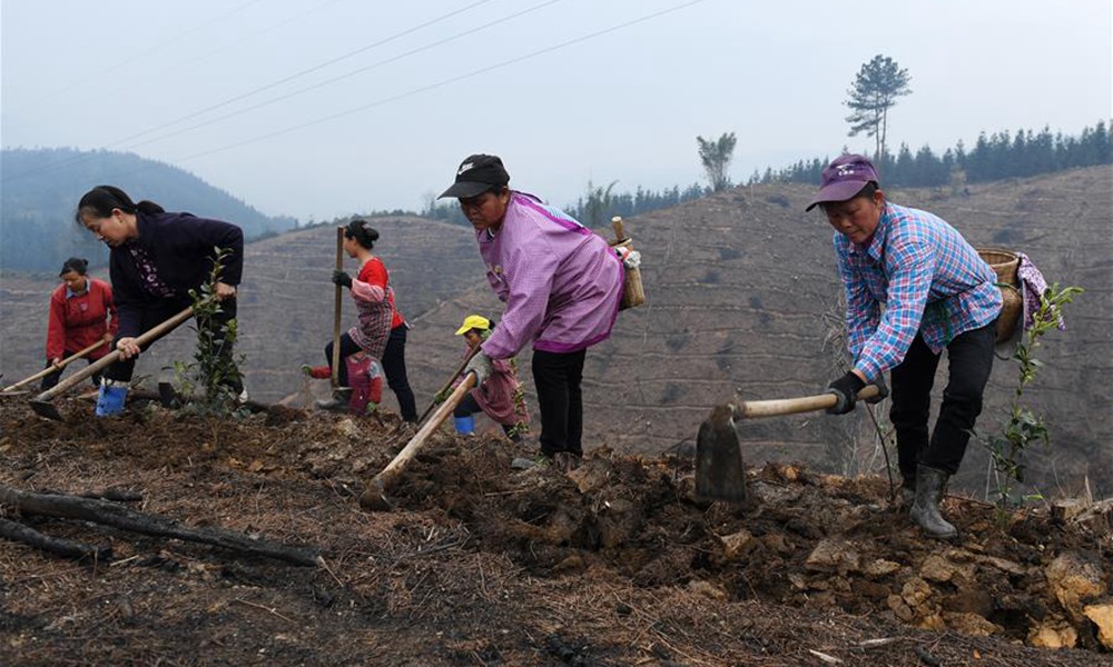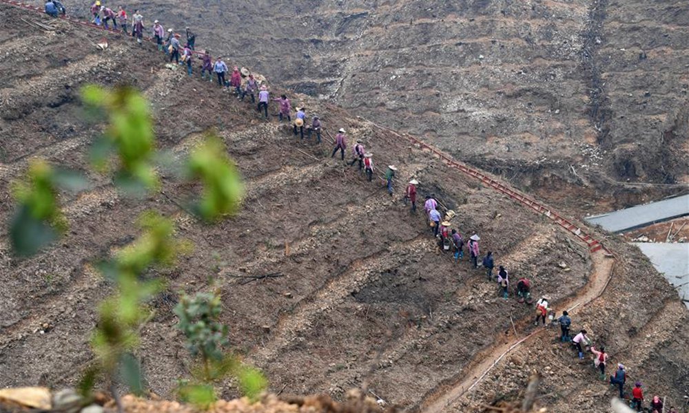 当日,广西三江侗族自治县丹洲古篮千亩油茶基地一片忙碌,当地群众正抢抓农时种植油茶。据介绍,三江侗族自治县现有油茶林61.7万亩,覆盖全县15个乡镇的86个贫困村。目前,全县正大力推进油茶品种改良工作,助力当地群众脱贫致富。图为3月13日,在广西三江侗族自治县丹洲古篮千亩油茶基地,当地群众在种植油茶。(摄影:陆波岸)