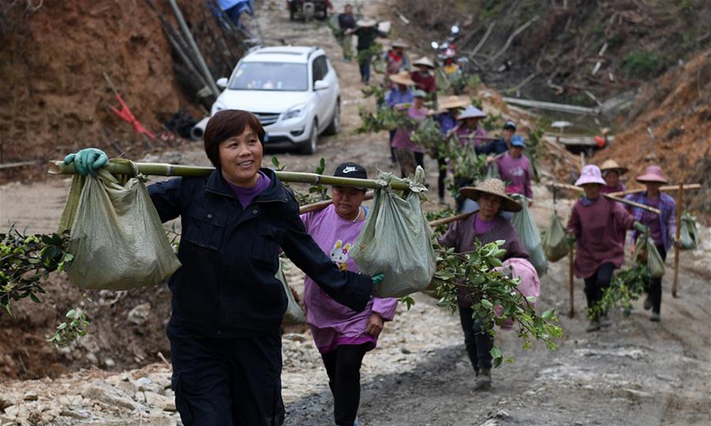 当日,广西三江侗族自治县丹洲古篮千亩油茶基地一片忙碌,当地群众正抢抓农时种植油茶。据介绍,三江侗族自治县现有油茶林61.7万亩,覆盖全县15个乡镇的86个贫困村。目前,全县正大力推进油茶品种改良工作,助力当地群众脱贫致富。图为3月13日,在广西三江侗族自治县丹洲古篮千亩油茶基地,当地群众在搬运水泥浆修建基地内的道路。(摄影:陆波岸)