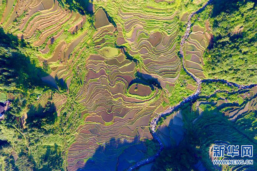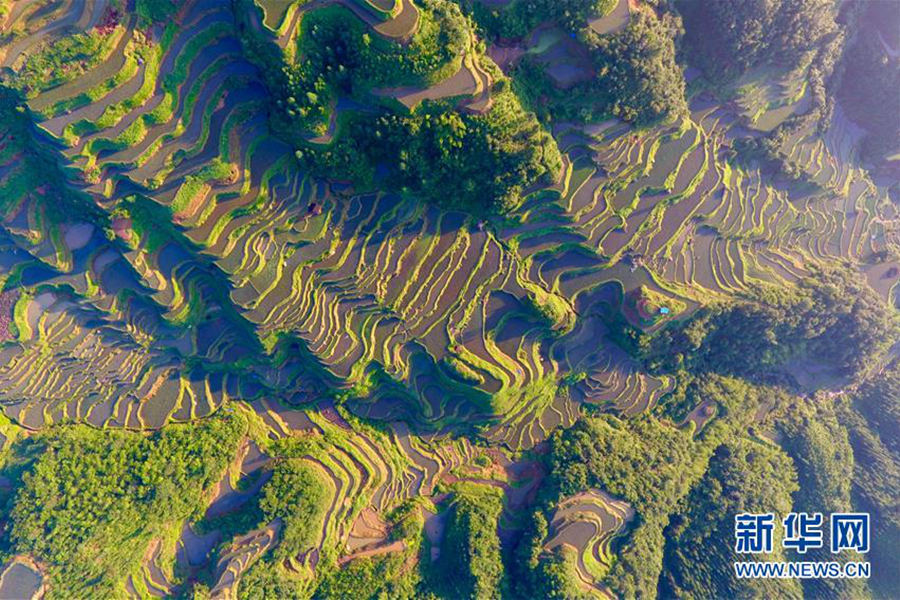 广西融水苗族自治县杆洞乡梯田纵横交错,木楼星罗棋布。夏日清晨,大苗山的田园在朝阳下美如画卷。黄孝邦摄