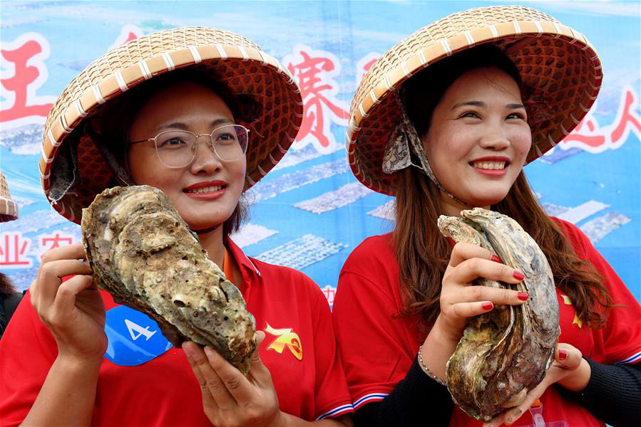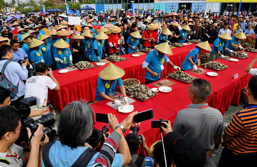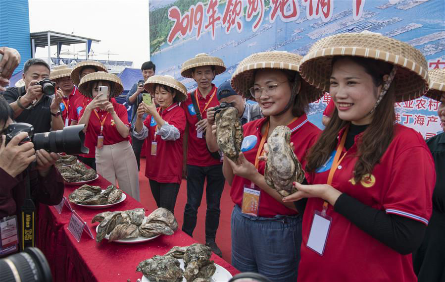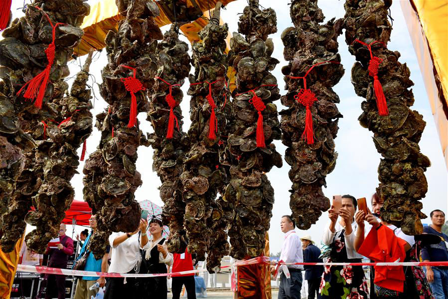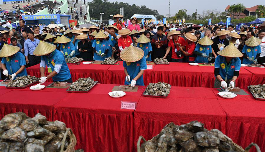 当日,广西钦州市举行2019年钦州“蚝情节”。近年来,钦州市通过发展蚝产业来实施乡村振兴战略,目前全市大蚝养殖面积达15万亩,年产量26.5万吨,年综合产值达28亿元。新华社记者 张国俊 摄