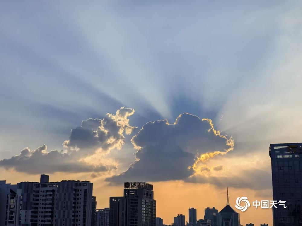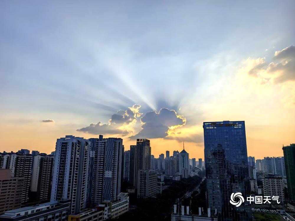 中国天气网广西站讯 10月11日,广西南宁天空出现“丁达尔”景观,一缕缕阳光洒向天空,呈现出“光的形状”,非常壮观。(图/韦坚 文/郁海蓉)