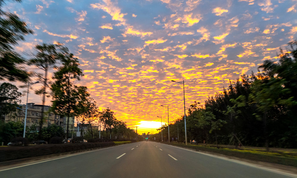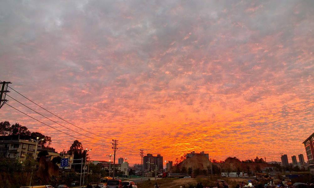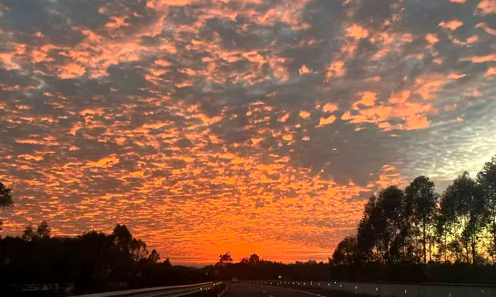 中国天气网广西站讯 天气谚语“天上鱼鳞斑,晒谷不用翻”,11月20日傍晚,广西钦州市城区上空西边出现大片 “鱼鳞斑” 状高积云刷屏朋友圈,五彩的晚霞交织铺满天际。当地气象部门表示,此类云系通常预示着高空稳定、水汽少,未来几天钦州将维持晴好干燥天气,气温适宜,昼夜温差略有增大。(图/李斌喜 陈家弟 文/李宏宇)
