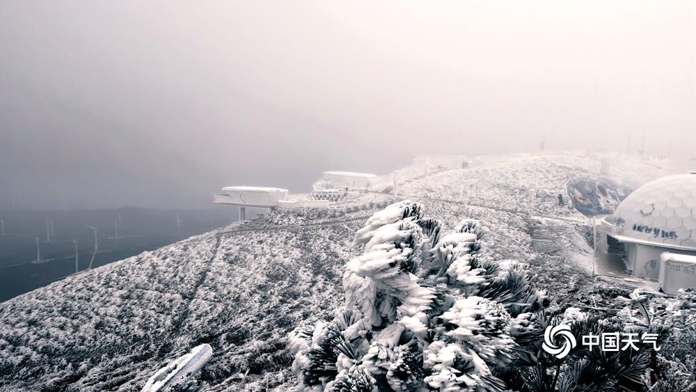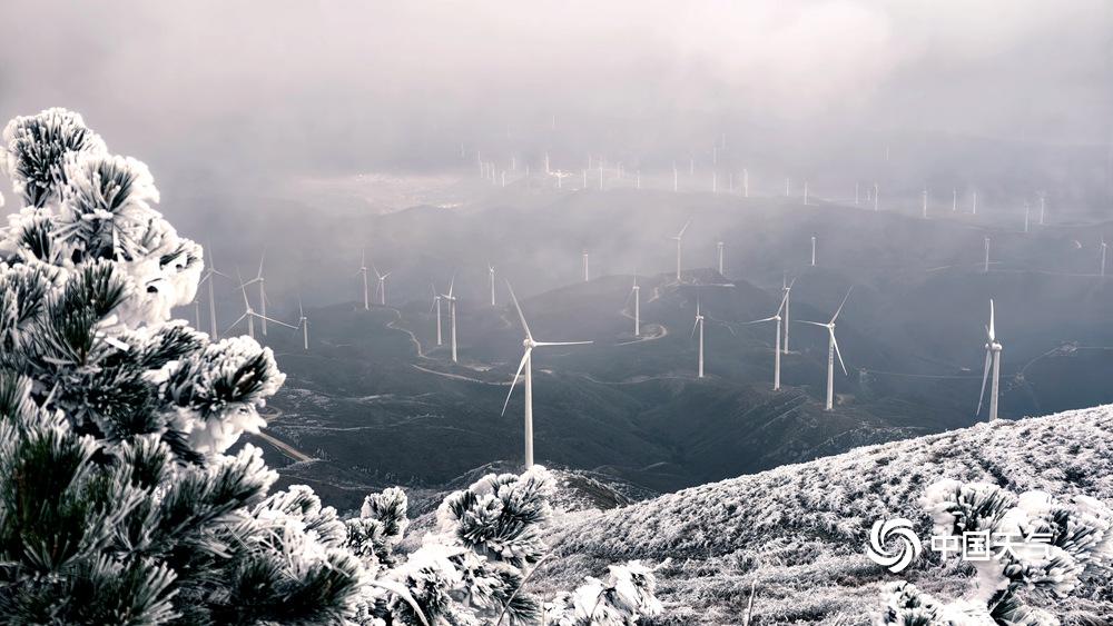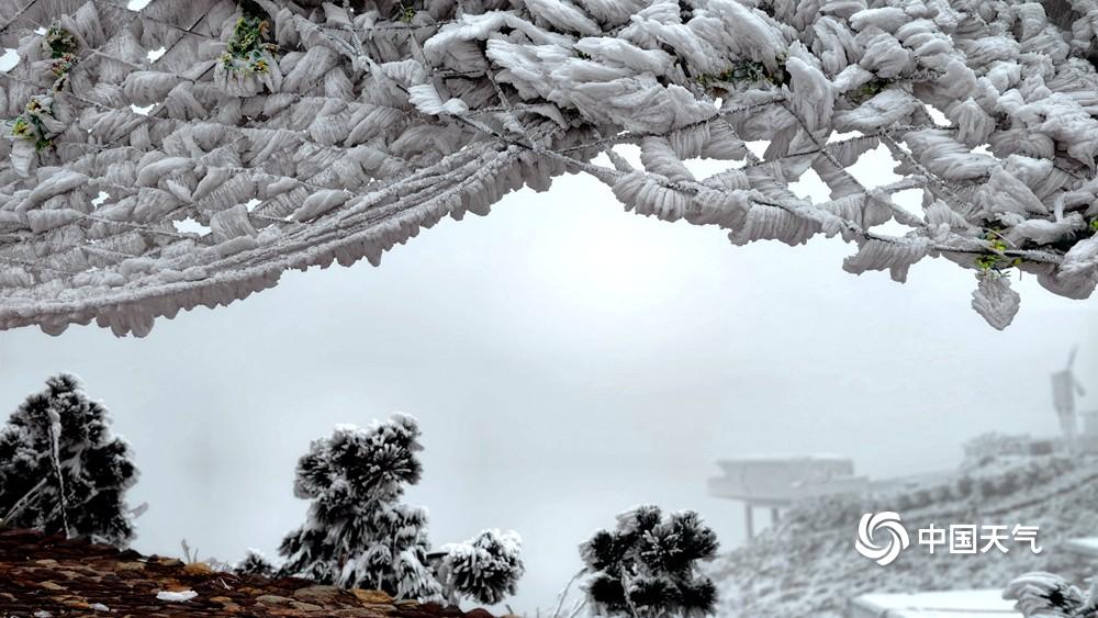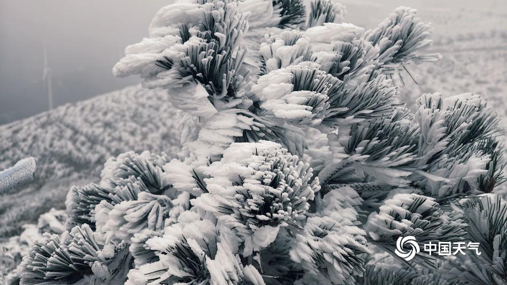 中国天气网广西站讯讯 新年冷空带来降温,1月2日,桂林市兴安县高寒山区最低气温低至零下,摩天岭被雾凇覆盖,瑞雪迎新年,给南国带来不一样的新年礼物。(图/张雅昕 文/文萌)