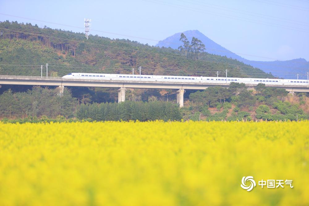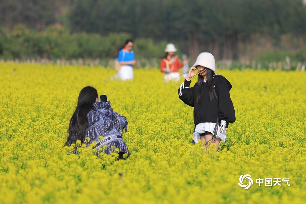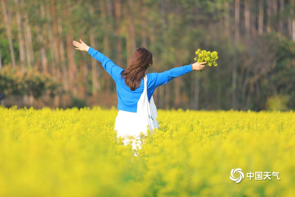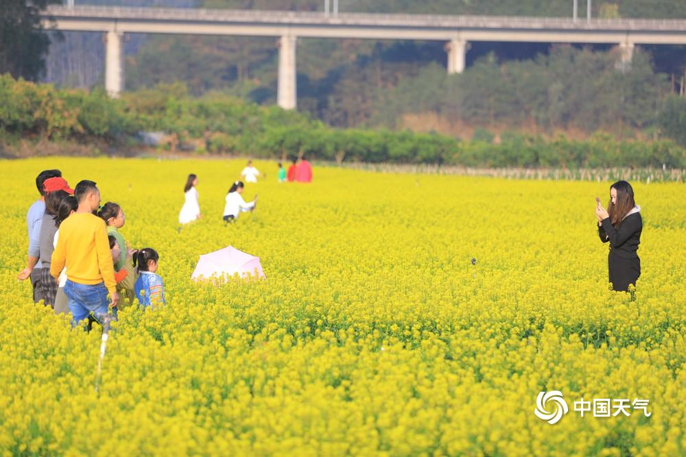 中国天气网广西站讯 2月22日,百色市田东县天气晴好,祥周镇仑圩村内的一片油菜花海吸引了不少游客前去观赏游玩。花丛中,游客们或悠闲漫步,感受着微风中油菜花的淡淡清香;或停下脚步拍照留念,用镜头定格这美丽的春日盛景。金黄的油菜花与湛蓝的天空相互映衬,构成了一幅绝美的田园风光图。(文/何翔 图/农继豪)