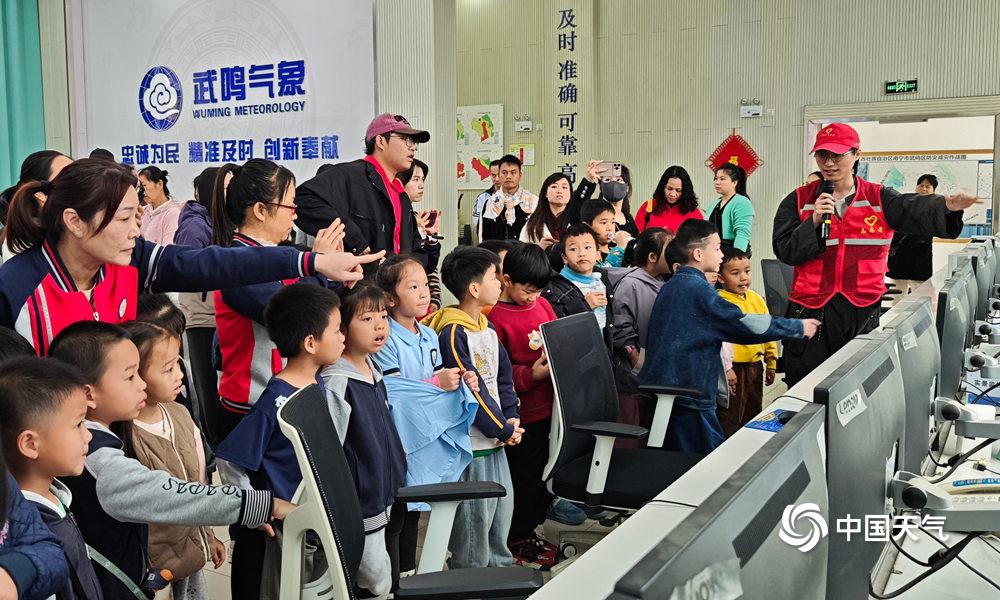 中国天气网广西站讯3月21日,在第66个世界气象日来临之际,南宁市武鸣区气象局迎来了一群活泼可爱的壮乡萌娃。孩子们牵着爸爸妈妈的手,迈着轻快的脚步走进气象站,开启了一场充满趣味与新知的亲子研学之旅。图为孩子和家长们在气象业务平台参观。(图/陆程蕾 李亦乔 文/蒙菲菲)