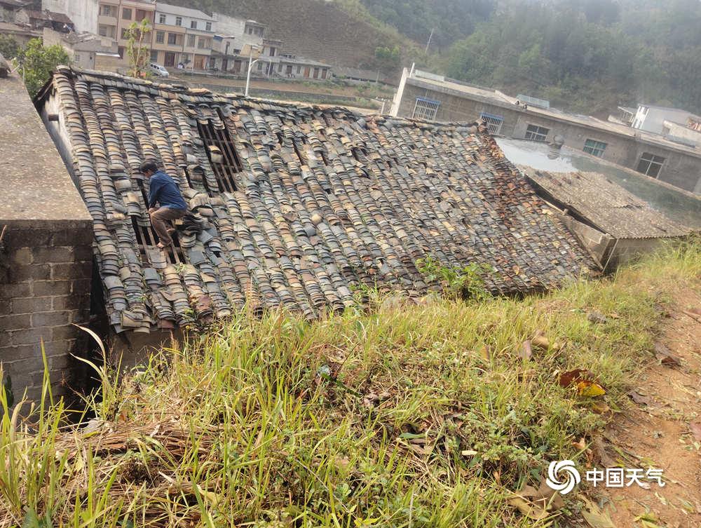 中国天气网广西站讯 4月3日夜间,百色市那坡县出现短时雷暴大风、冰雹天气。冰雹致使农户屋顶瓦片被砸烂、花椒树枝叶受损;大风掀翻部分铁皮屋顶,吹弯甚至刮断桉树。图为被冰雹砸出一个个窟窿的瓦片屋顶。(图/唐毓洲 文/谭金闪)