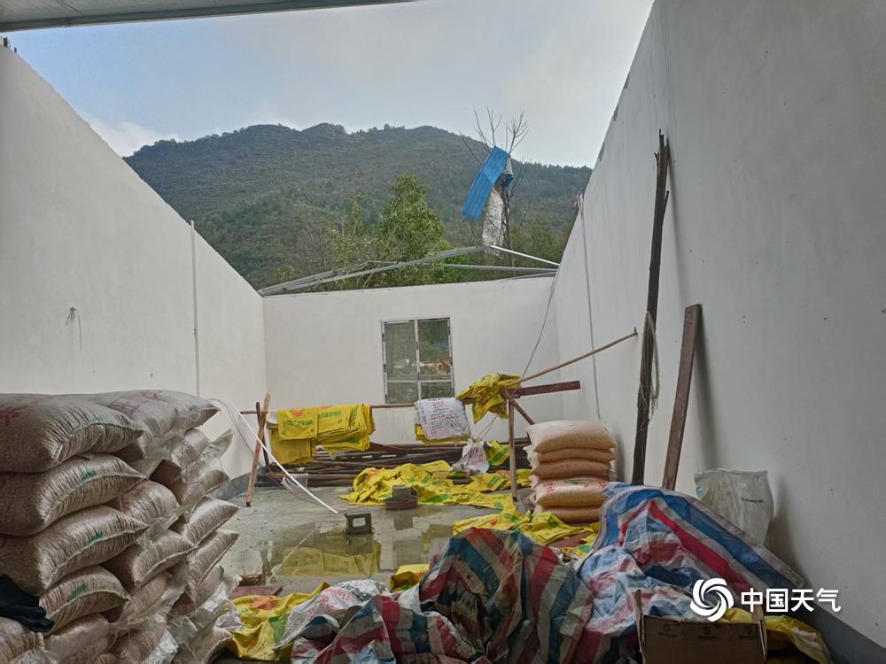 中国天气网广西站讯 4月3日夜间,百色市那坡县出现短时雷暴大风、冰雹天气。冰雹致使农户屋顶瓦片被砸烂、花椒树枝叶受损;大风掀翻部分铁皮屋顶,吹弯甚至刮断桉树。图为被大风吹走屋顶的房屋。(图/唐毓洲 文/谭金闪)
