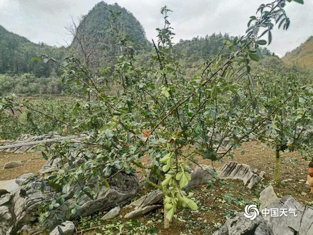 中国天气网广西站讯 4月3日夜间,百色市那坡县出现短时雷暴大风、冰雹天气。冰雹致使农户屋顶瓦片被砸烂、花椒树枝叶受损;大风掀翻部分铁皮屋顶,吹弯甚至刮断桉树。图为枝叶受损的花椒树。(图/唐毓洲文/谭金闪)