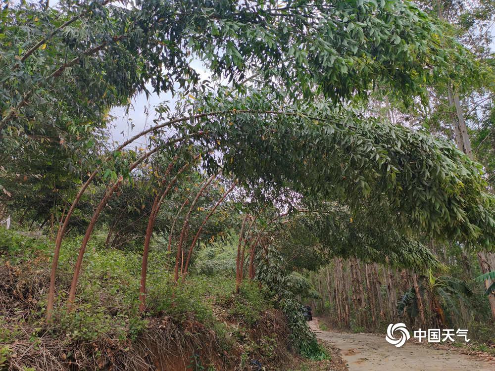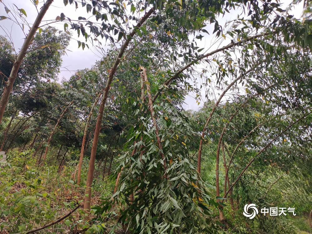 中国天气网广西站讯 4月3日夜间,百色市那坡县出现短时雷暴大风、冰雹天气。冰雹致使农户屋顶瓦片被砸烂、花椒树枝叶受损;大风掀翻部分铁皮屋顶,吹弯甚至刮断桉树。图为被大风吹弯的桉树。(图/唐毓洲 文/谭金闪)