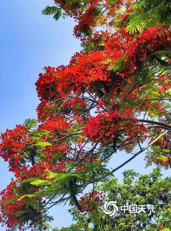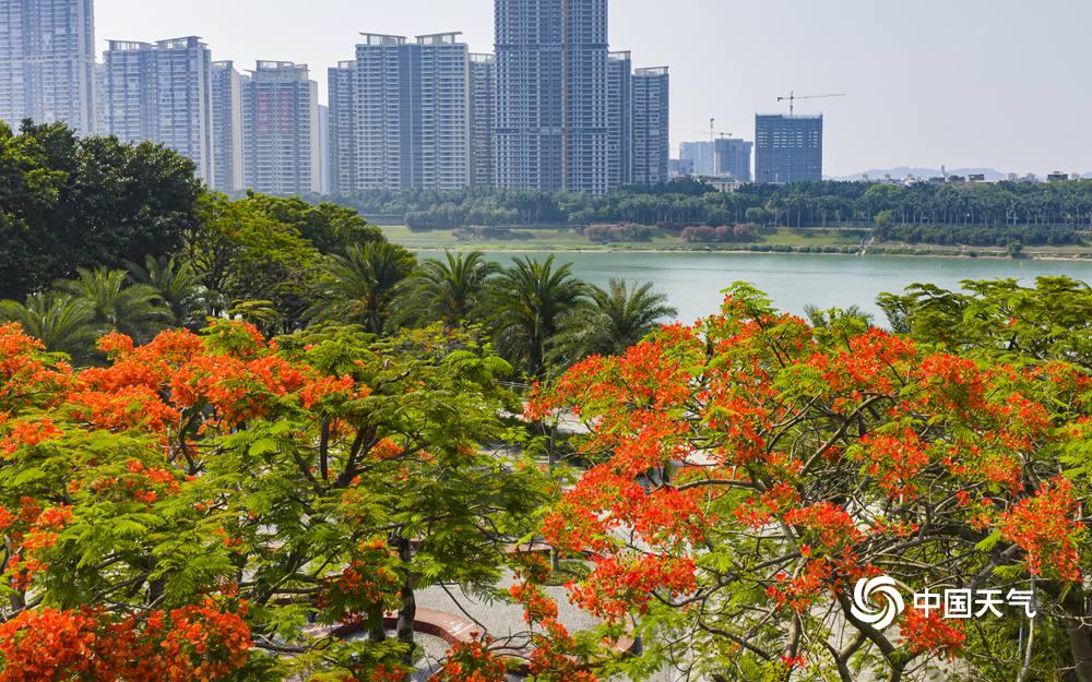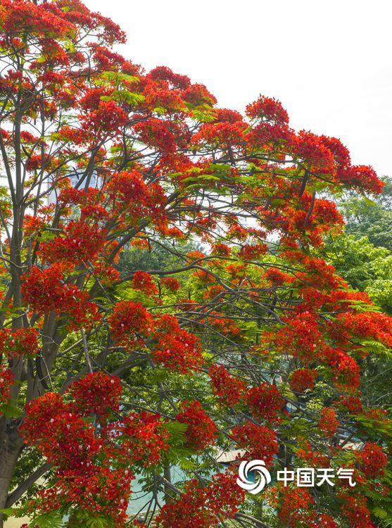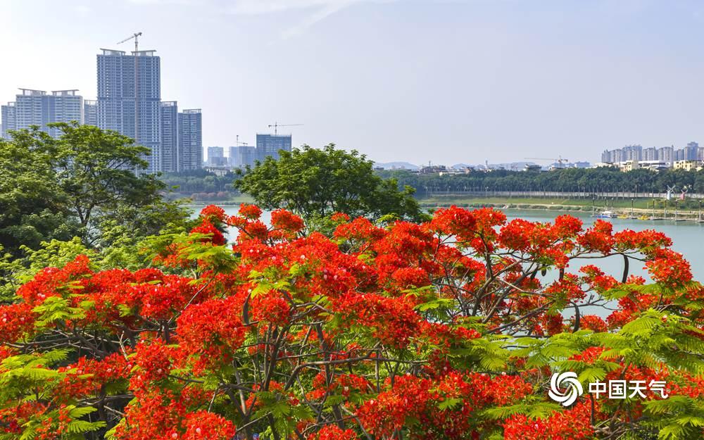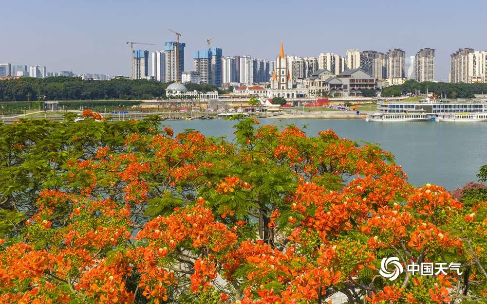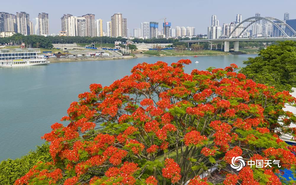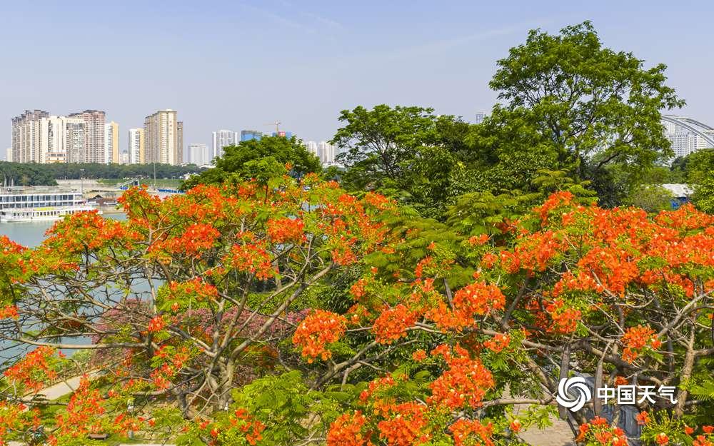 中国天气网广西站讯 近日,南宁邕江两岸的凤凰树悄然开花,枝头一片火红。盛放的花朵如烈焰般点缀江畔,为城市增添了热烈气息。绚丽的凤凰花吸引市民驻足观赏,成为邕江边一道亮丽风景线。(图/曾海科 文/郁海蓉)