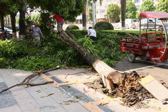 大客车压断树木冲出路面,救援人员正将吊索固定在车头。(摄影:杨馥祯)