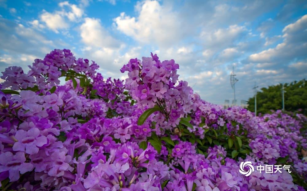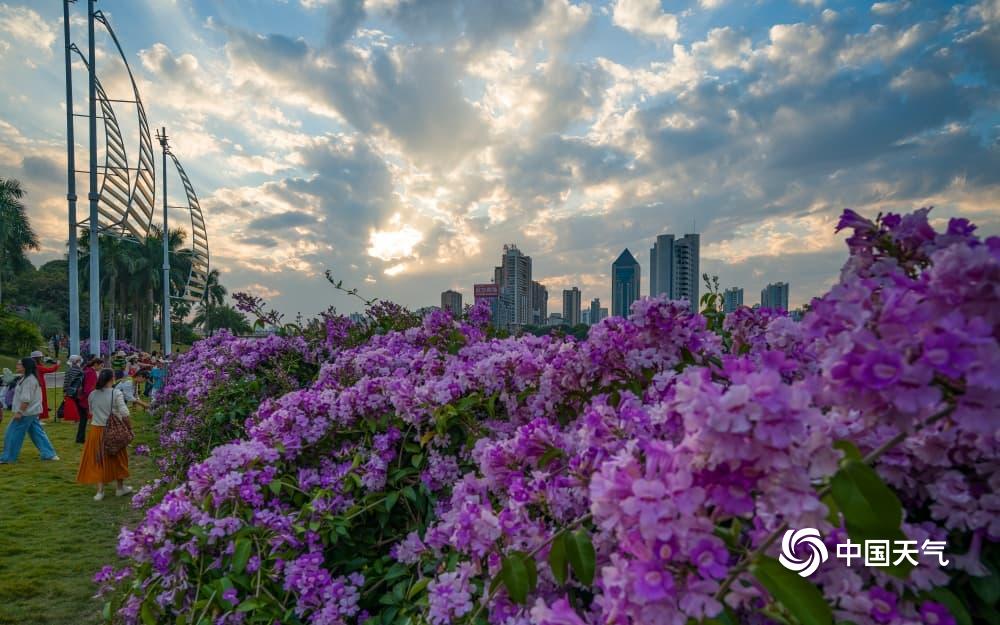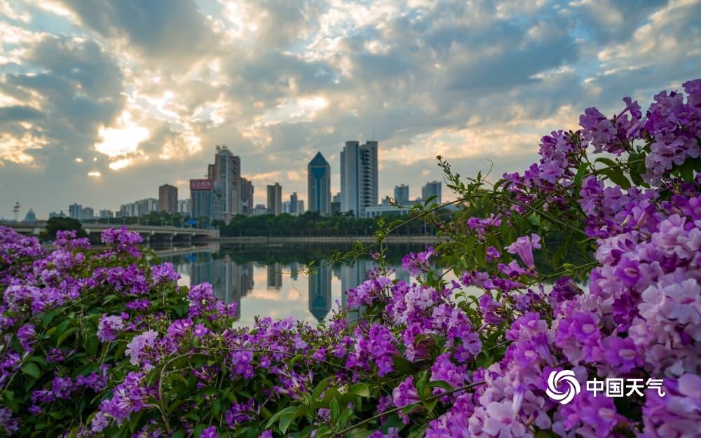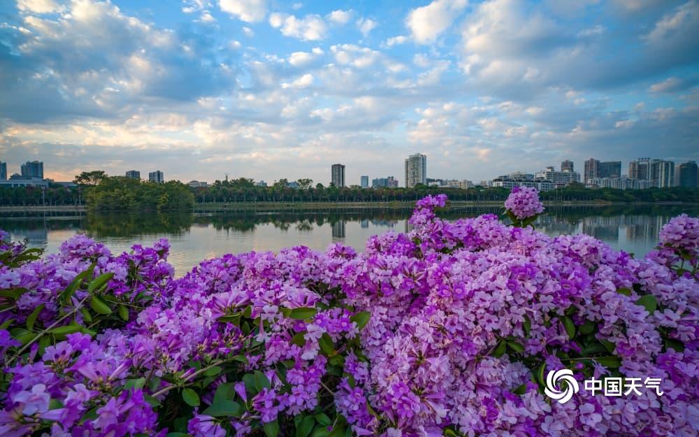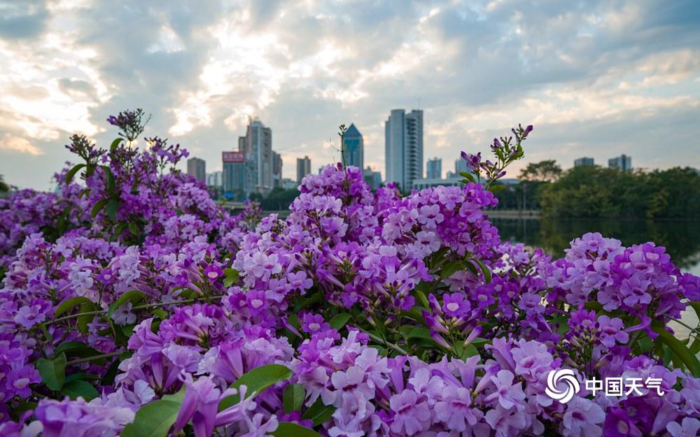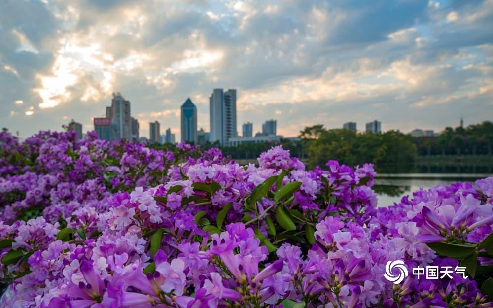 中国天气网广西站讯 已经进入12月,我国北方已是千里冰封万里雪飘,地处华南的广西却仍是青山绿树姹紫嫣红。12月2日,南宁市南湖东岸的蒜香藤花再次绽放,紫色浪漫溢满南湖,在晚霞的映衬下更显华丽。(图文/曾海科)