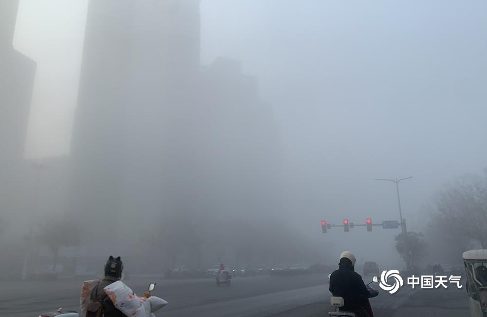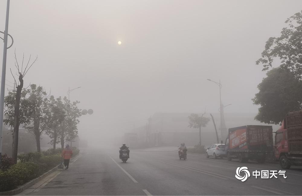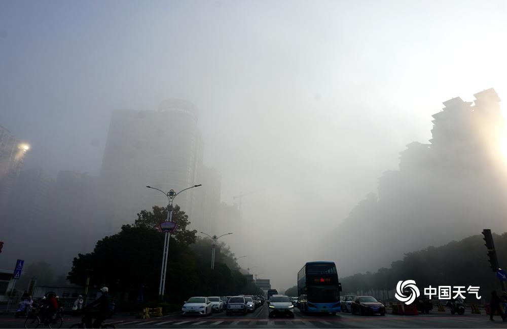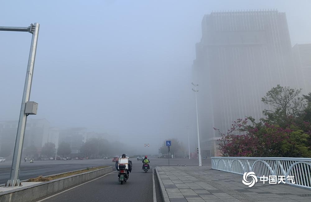 中国天气网广西站讯 12月11日,受偏南暖湿气流影响,桂林临桂区出现大雾天气,局部地区能见度不足50米。雾浓得像墨,高楼隐去,车潮裹着朦胧缓缓前行。(图文/蒋熙 屈红梅)