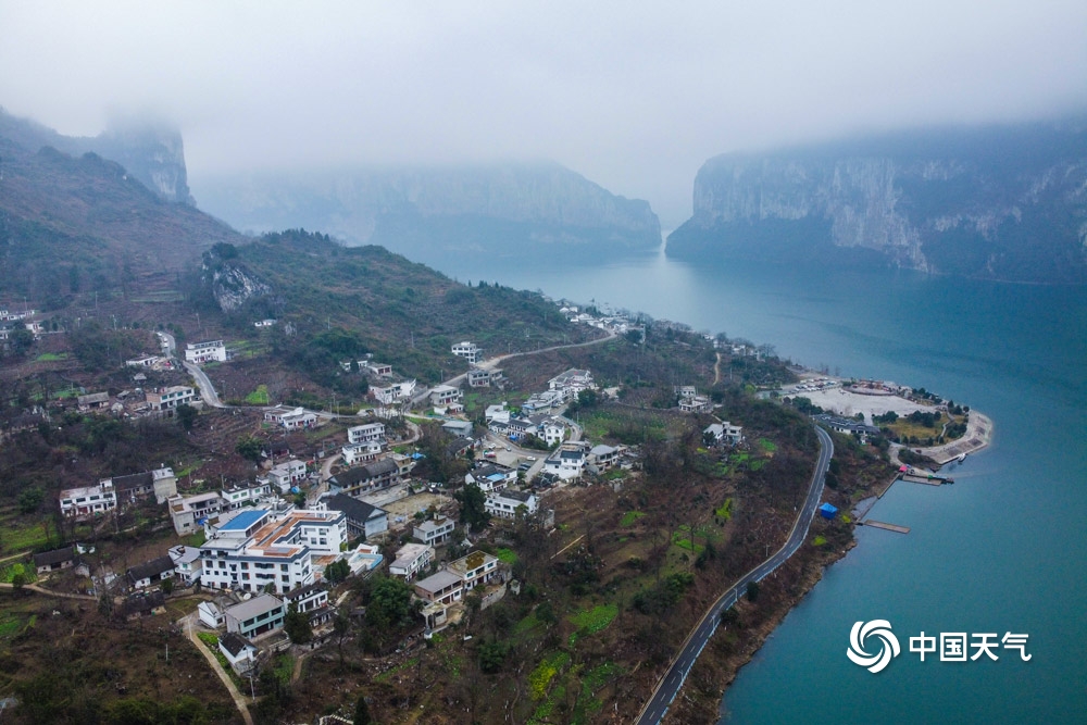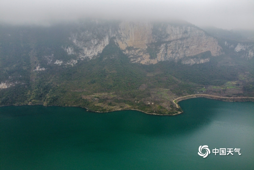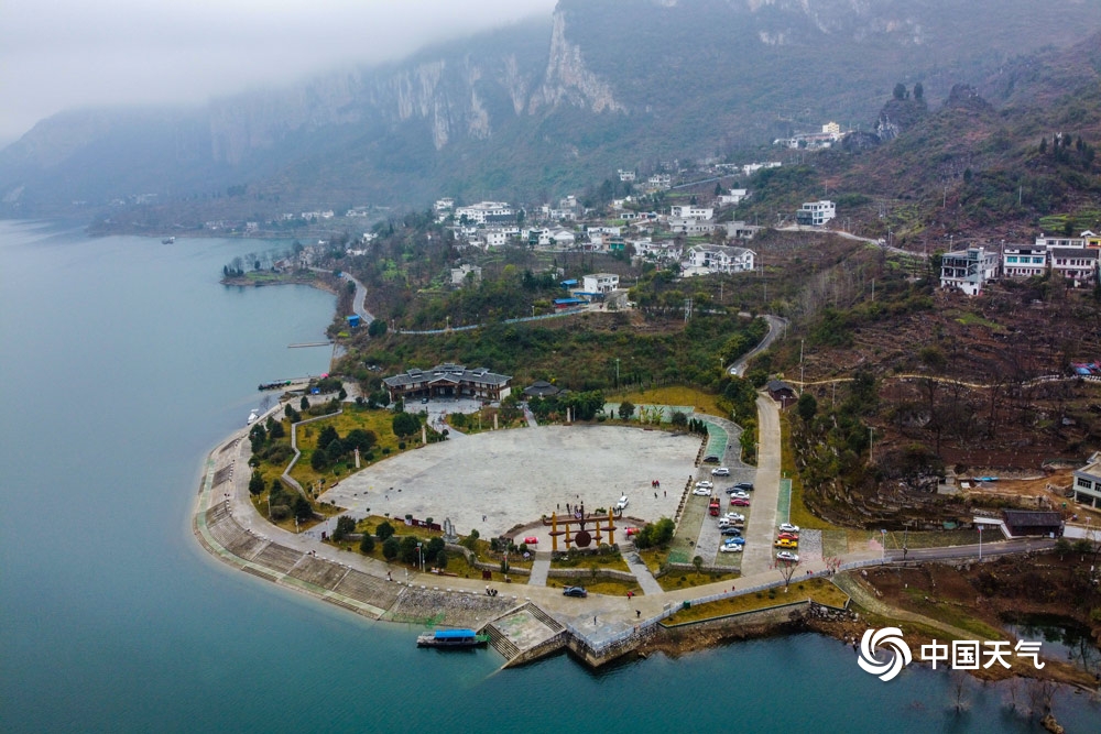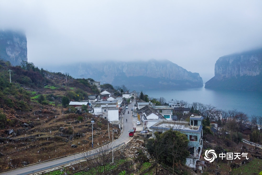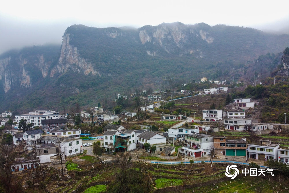 初春时节,位于贵州省毕节市黔西县新仁乡乌江源百里画廊边的化屋村苗寨云雾缭绕,别有一番景致。