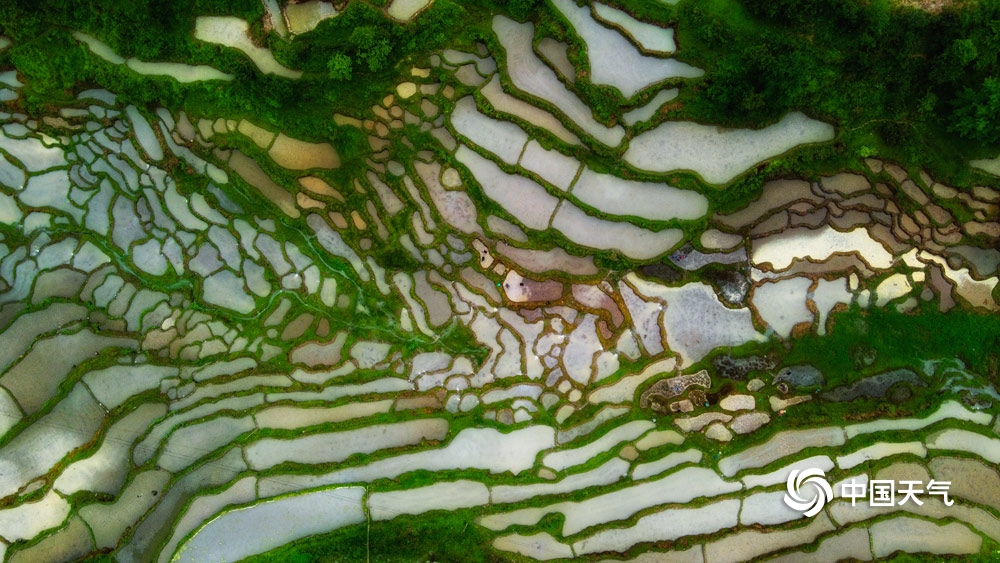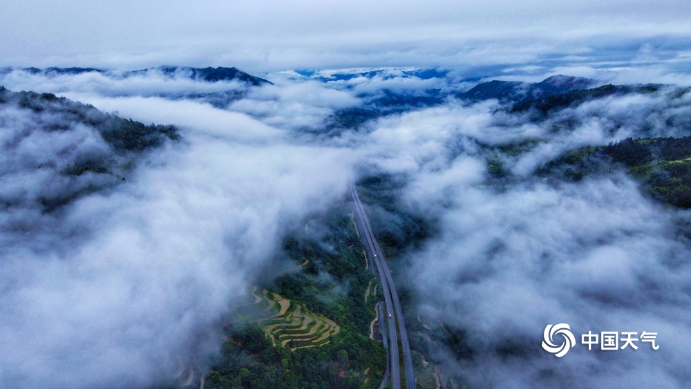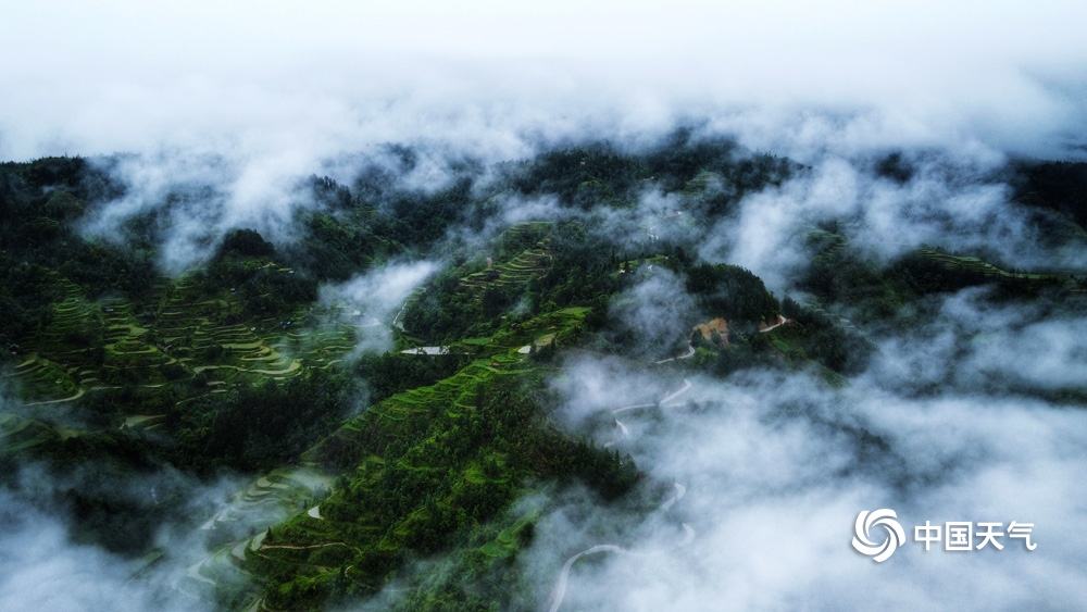 近日,贵州进入雨水密集期,在贵州黎平黄岗村雨后初霁,延绵蜿蜒的梯田和耕作的农民、远处的山峦、盘山公路在云雾中若隐若现,构成一副优美的田园画卷,仿若世外桃源。