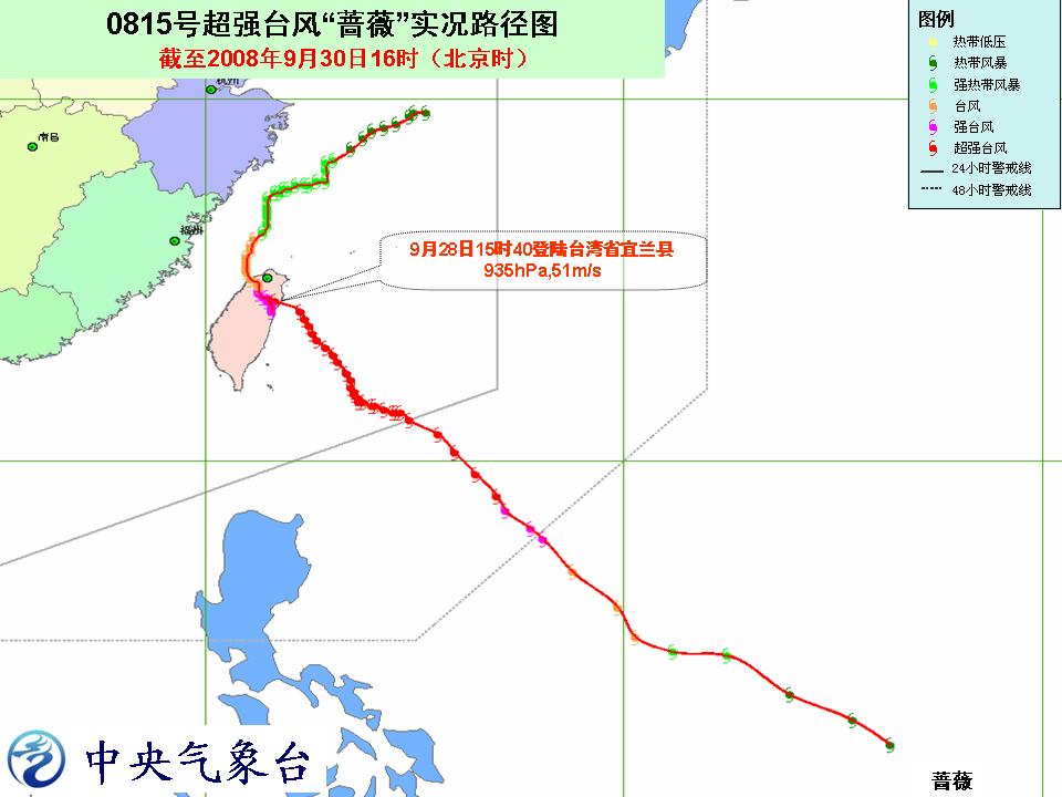 | 2008年09月28日16时 | 24.4 | 121.7 | 935 | 51 |