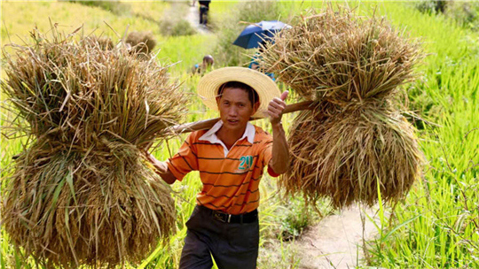时值金秋,鄂西大山深处一派丰收景象。金灿灿的玉米梆子,晒出农民丰收的喜悦。图为9月28日,湖北恩施市屯堡乡马者村下大块6组村年近七旬的村民彭腊翠正在晒玉米。(图/张洪刚)