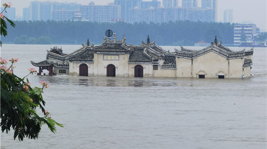 中国天气网讯 近日,湖北遭遇多轮强降水天气过程,长江水位上涨。鄂州观音阁被誉为“万里长江第一阁”,位于长江鄂州段江心一块巨石之上。尽管江水已将观音阁淹没大半,但它依然屹立江心,岿然不动,经受住了洪水考验。图为14日拍摄的鄂州观音阁,江水已经将它淹没大半。(图/冯光柳)