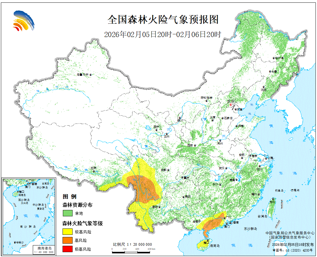 预计,2026年2月5日20时至2月6日20时,广东西部、广西东南部、海南大部、四川西部和南部、云南北部和西部、西藏东部等地的部分地区森林火险气象等级较高,其中,广东西南部、广西东南部、四川西南部、云南西北部、西藏东南部的局部地区森林火险气象等级高。请各有关单位严加防范,加强火源管理,确保林区安全。