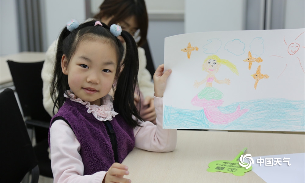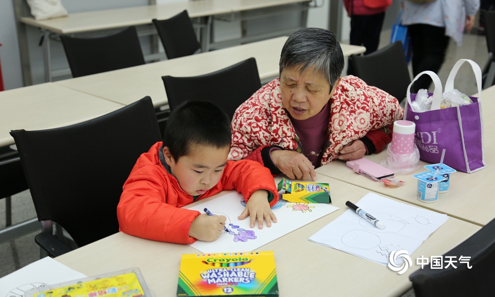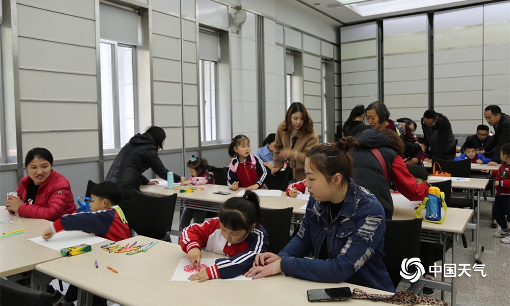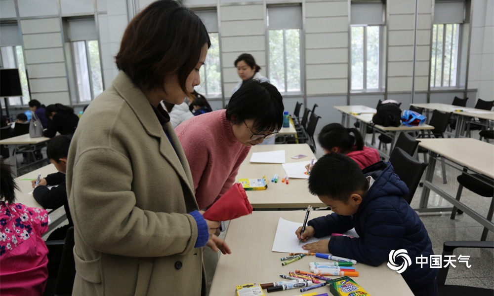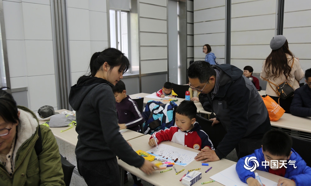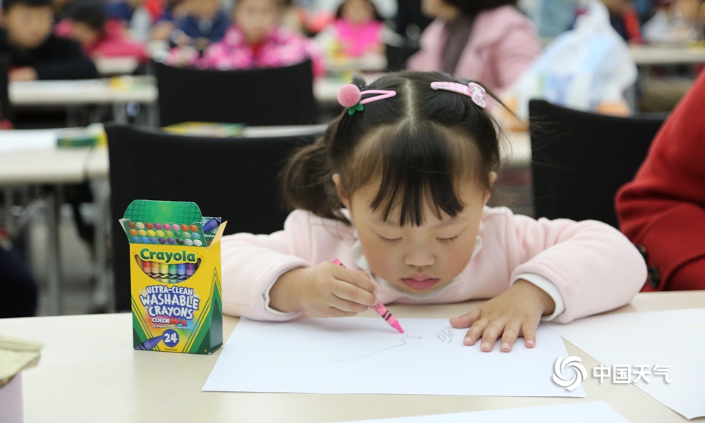 “323”世界气象日,很多小朋友跟着家长到南京北极阁山参加今年的气象日开放活动,并且参加了“宝贝画天气”活动,图为小朋友们在现场,认真的绘画,描绘出自己心中关于天气的画面。(拍摄:孙啸)
