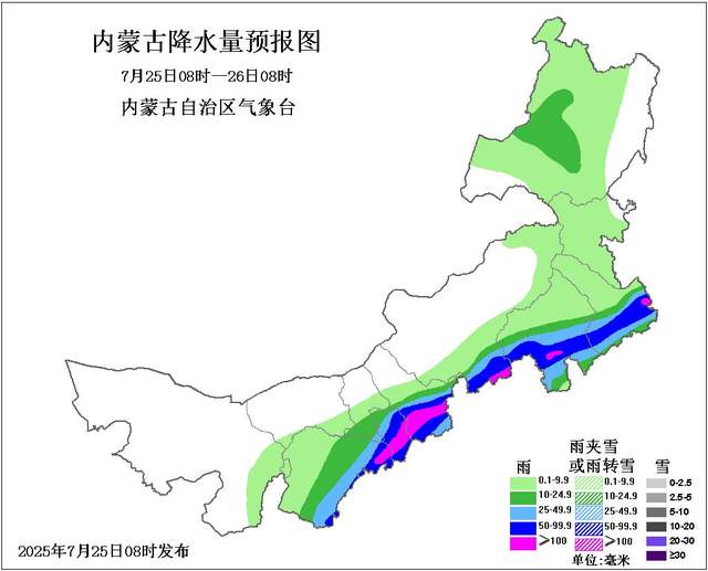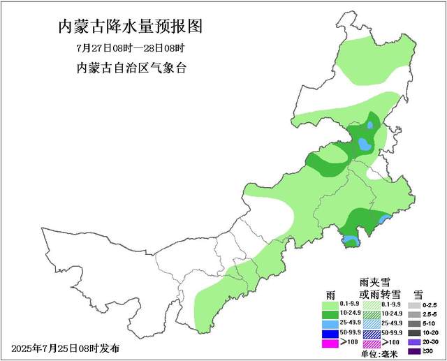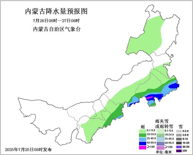 25日08时至26日08时,南部和东部大部地区多云,有小雨或雷阵雨,鄂尔多斯市东部、包头市南部、呼和浩特市大部、乌兰察布市南部、锡林郭勒盟南部、赤峰市中部和南部、通辽市南部、呼伦贝尔市西北部有中到大雨,鄂尔多斯市东部偏东、包头市东南部部分地区、呼和浩特市中部和南部、乌兰察布市南部偏南、锡林郭勒盟南部偏南、赤峰市南部部分地区、通辽市南部部分地区有暴雨,局地有大暴雨,上述部分地区伴有短时强降水、雷暴大风、冰雹等强对流天气;西部偏西和偏北部分地区有35度及以上的高温天气,西部偏西北地区有37度及以上的高温天气。