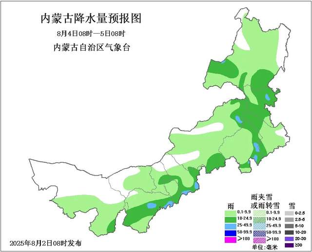 04日08时至05日08时,西部偏南和偏东、中东部大部地区多云,有小雨或雷阵雨,其中,阿拉善盟东南部、鄂尔多斯市中部和东北部、包头市中部、呼和浩特市西北部和南部、乌兰察布市南部、锡林郭勒盟南部和东北部、赤峰市南部和东部、通辽市西部、兴安盟大部、呼伦贝尔市南部有中雨,局地有大雨,上述部分地区伴有短时强降水、雷暴大风、冰雹等强对流天气;西部偏西地区4、5级短时6、7级西北风;西部偏北地区有35℃及以上的高温天气。