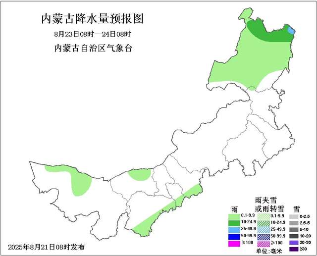 21日08时至22日08时,西部偏东南、中东部大部地区多云,有小雨或雷阵雨,其中,锡林郭勒盟东部部分地区、赤峰市、通辽市、兴安盟、呼伦贝尔市大部有中雨,赤峰市东南部、通辽市南部、兴安盟南部和东北部、呼伦贝尔市西北部有大雨,局地有暴雨,上述部分地区伴有短时强降水、雷暴大风、冰雹等强对流天气;中西部偏北和东部大部地区4、5级短时6、7级局地8级偏西风或偏南风。