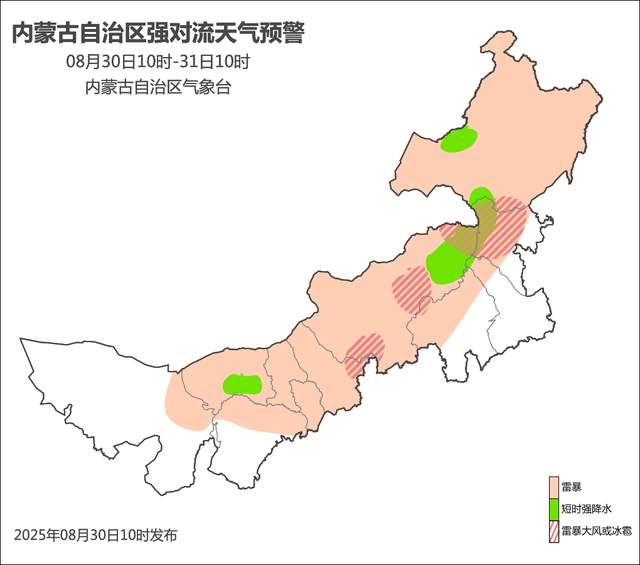 预计8月30日10时至8月31日10时,阿拉善盟东北部、巴彦淖尔市、鄂尔多斯市北部、包头市、呼和浩特市、乌兰察布市、锡林郭勒盟、赤峰市北部、通辽市西北部、兴安盟西部和北部、呼伦贝尔市有雷暴天气;巴彦淖尔市东南部、锡林郭勒盟东北部、通辽市西北部、兴安盟西部、呼伦贝尔市西部部分地区有短时强降水天气,小时降水量15-30毫米;乌兰察布市东南部、锡林郭勒盟西南部和东北部部分地区、兴安盟西部和北部、呼伦贝尔市南部有雷暴大风或冰雹天气。