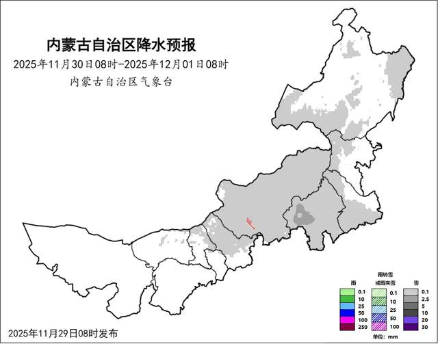 30日08时至01日08时,西部偏东北、中东部大部地区多云,有分散性小雪,其中,赤峰市西北部有中雪;西部偏东、中部大部和东南部偏西地区有5、6级短时7、8级西北风;中东部大部地区气温下降4到6℃,中部偏东地区气温下降6到8℃,局地气温下降8到10℃。