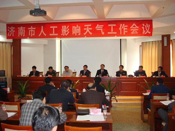 2008年10月23日,济南市人民政府主持召开人工影响天气工作会议,济南市人工影响天气指挥部指挥、市政府副市长赵文朝,省气象局副局长李春虎到会并讲话,参加会议的还有济南警备区、济南空军司令部航管处、市发改委、财政局、人事局、水利局、农业局等相关单位,以及各县(市)区政府分管领导和县乡两级人武部部长。会议回顾总结了近年来济南市人工影响天气特别是南部山区增雨保泉工作,表彰了在全市人影工作中做出突出贡献的先进单位和个人,部署当前和今后一个时期的人工影响天气工作。 赵文朝副市长在讲话总充分肯定了济南市人工影响天气工作的组织形式、体系建设和工作成绩。济南市人工增雨工作围绕经济社会发展大局,以涵养水源、防雹减灾、增雨保泉为重点,运用专武结合、军地合作的组织形式,在市政府财政投入近2500万元的支持下,通过科学规范的27处人影火箭定点布局建设,现代先进的人影预警指挥体系建设,综合效益明显,得到了全社会的认可和赞誉。赵文朝副市长还就今后一个时期济南人影工作提出了如下要求:一要进一步完善人影基础设施建设,重点抓好提高装备水平;二要进一步加强增雨保泉人工影响天气基地建设;三要提高机动增雨作业能力,强化重点水库、山区林地等重点区域的增雨能力以及黄河以北地区的防雹减灾能力;四要加强对全市降水天气形式本质特征的研究分析,力求指挥作业科学化,作业效果最大化;五要加强各方合作与技术协作,依靠科技进步和科技创新,全面增强济南人工影响天气能力建设;六要各级地方政府把南部山区人影基地建设和北部防雹减灾系统建设作为当地政府的工作任务,确定具体部门加强协调管理,健全全市、县(市)区、乡三级管理制度,按照职责分工,组织、协调、指导好本地人工影响天气工作。
