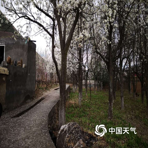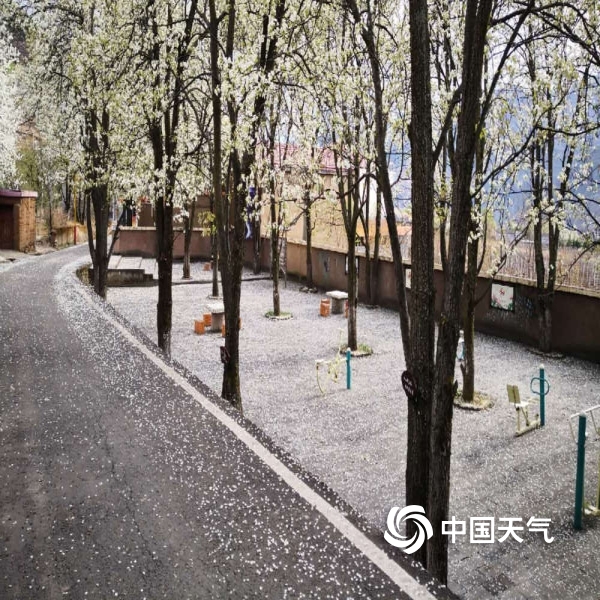 4月3日,阿坝州金川县的梨花开始凋零,花瓣不时飘落。在风雨中,花瓣更是纷纷扬扬,下起了“梨花雨”,洁白的花瓣为地面铺上了一层薄薄的“雪”,道路变成了花路。(图/文 李颖)