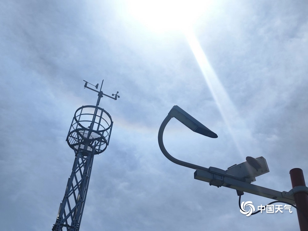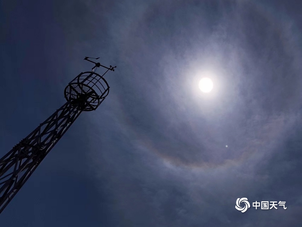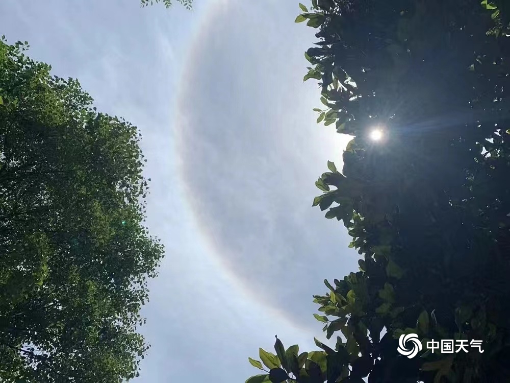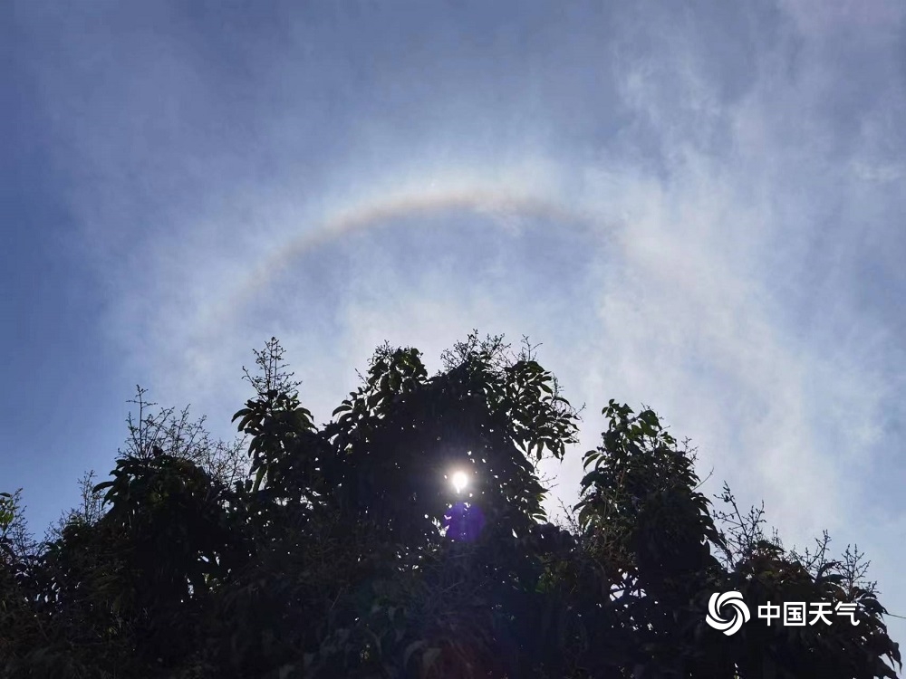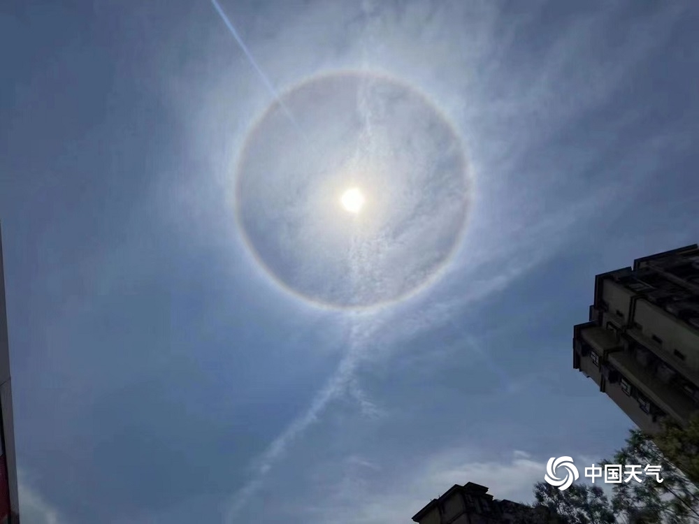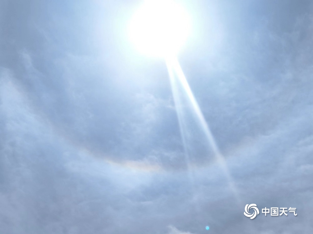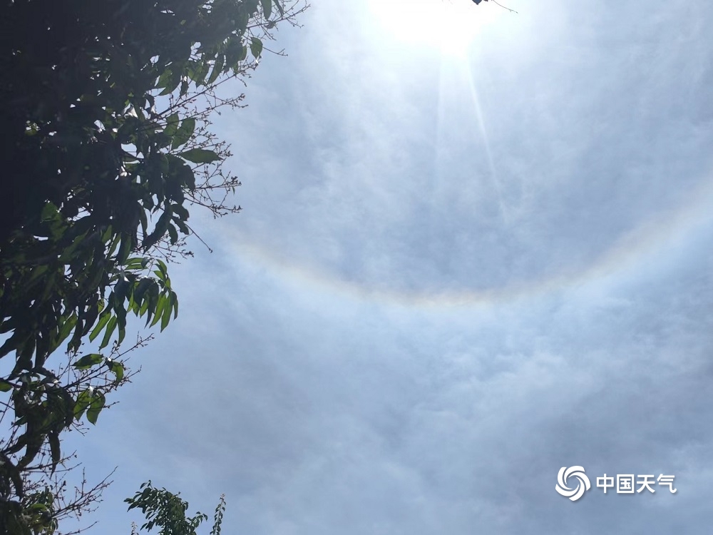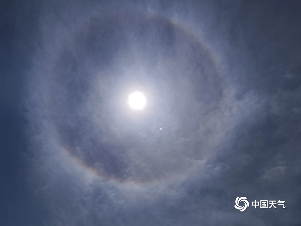 中国天气网讯 5月4日11时左右,泸州上空出现日晕这一气象奇观,太阳四周环绕着一道光圈,十分的好看。日晕又叫圆虹,是日光通过云层中的冰晶时,经折射形成的大气光学现象。(图/陈以华、朱健、刘巧灵 文/朱健)