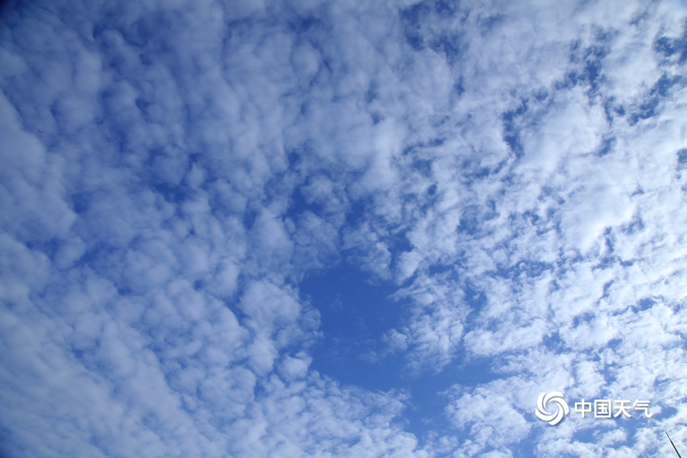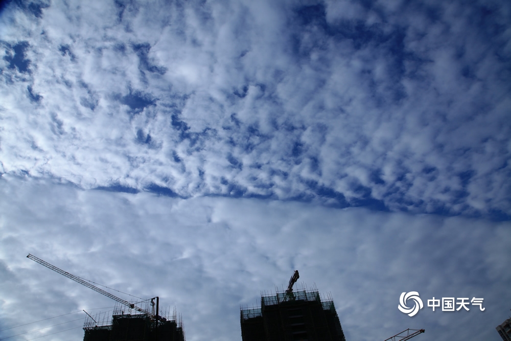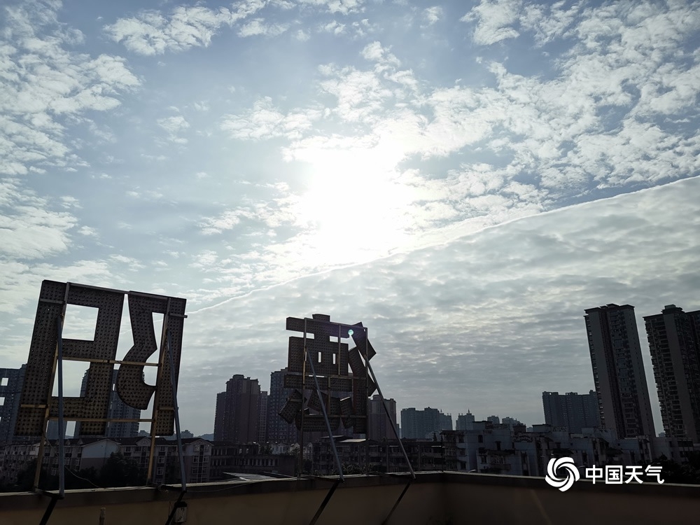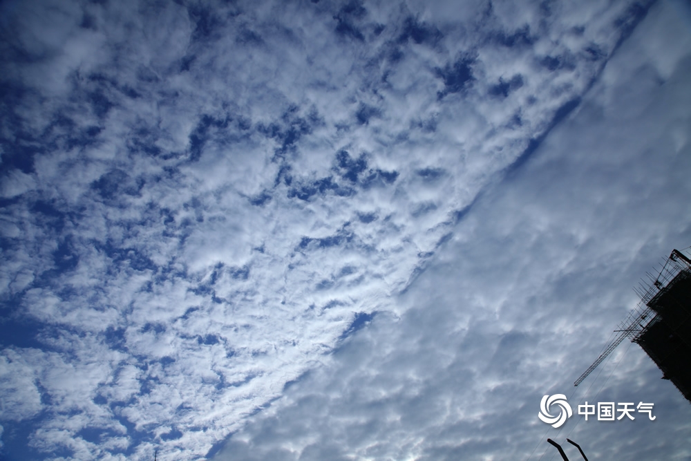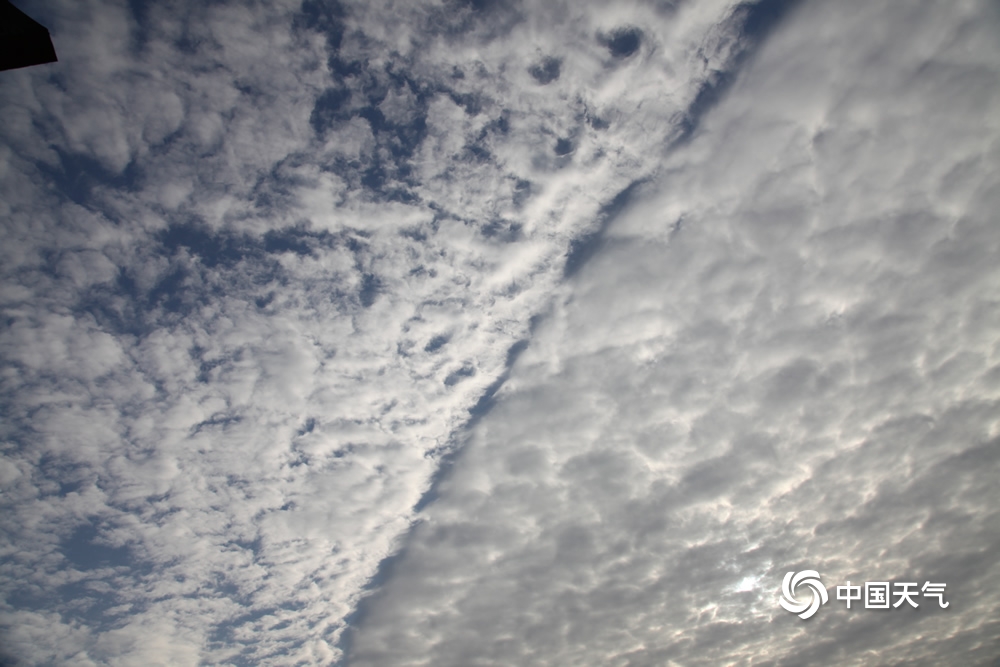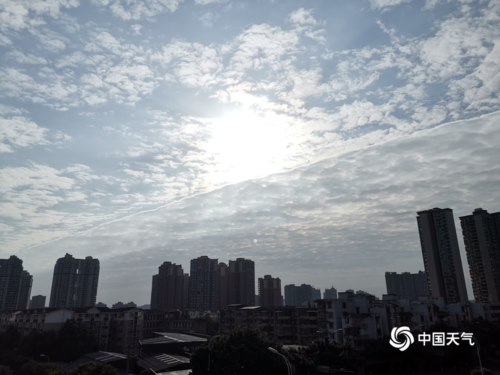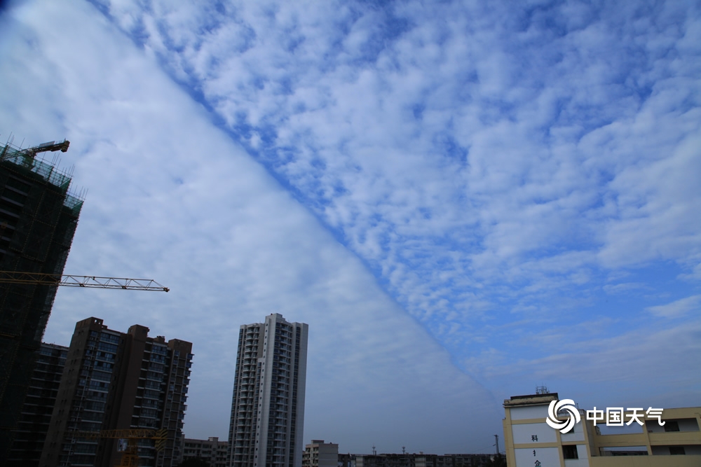 中国天气网讯 今日(14日)上午,四川德阳的天空被一分为二,一半蓝天白云,一半阴云密布,而中间是一道整齐的云界,十分神奇。这是由于冷空气推进中在云的北部边界由于气流下沉形成的整齐边界线,一班形成于冷暖气影响后期。图片摄于11月14日上午德阳城区。(图/王远东)